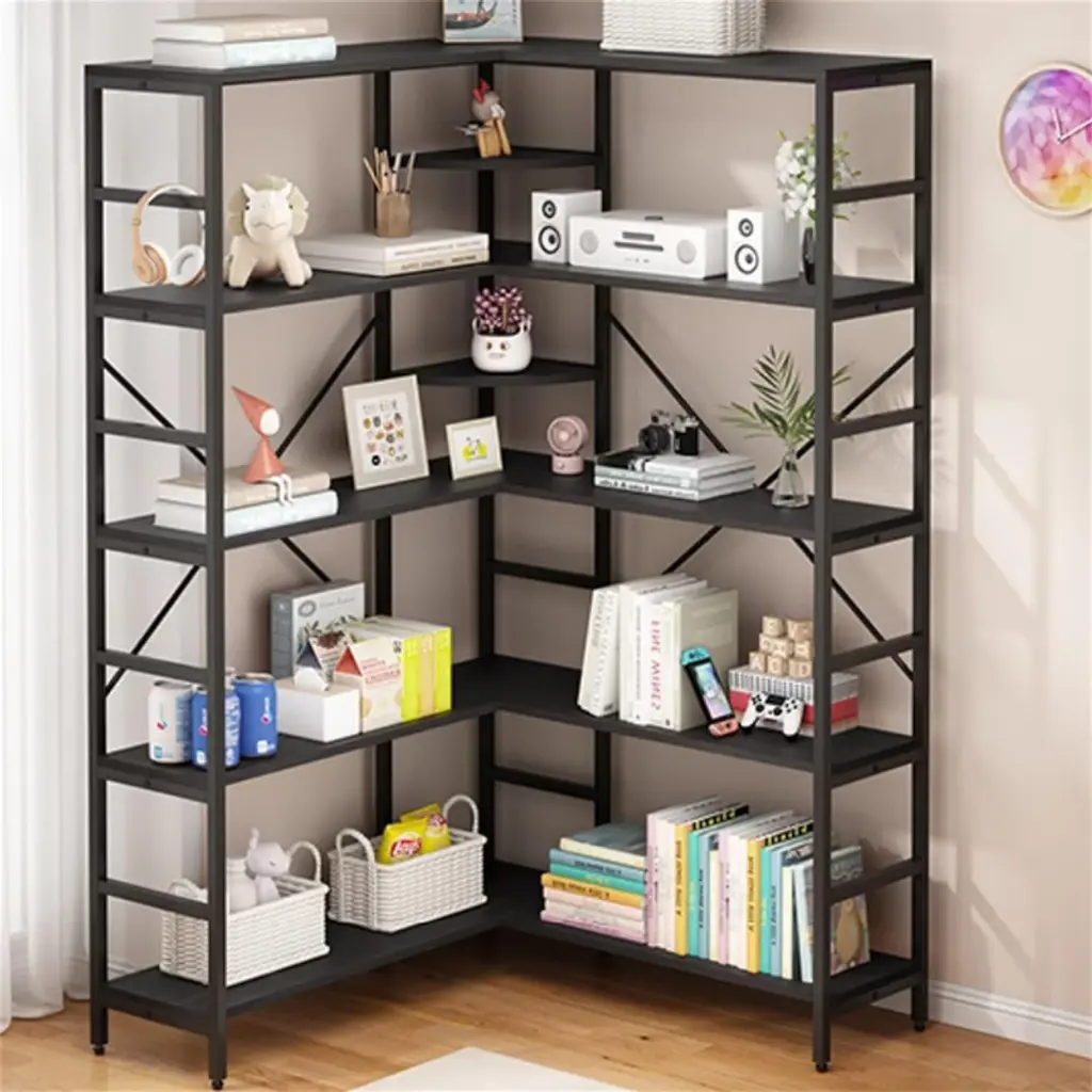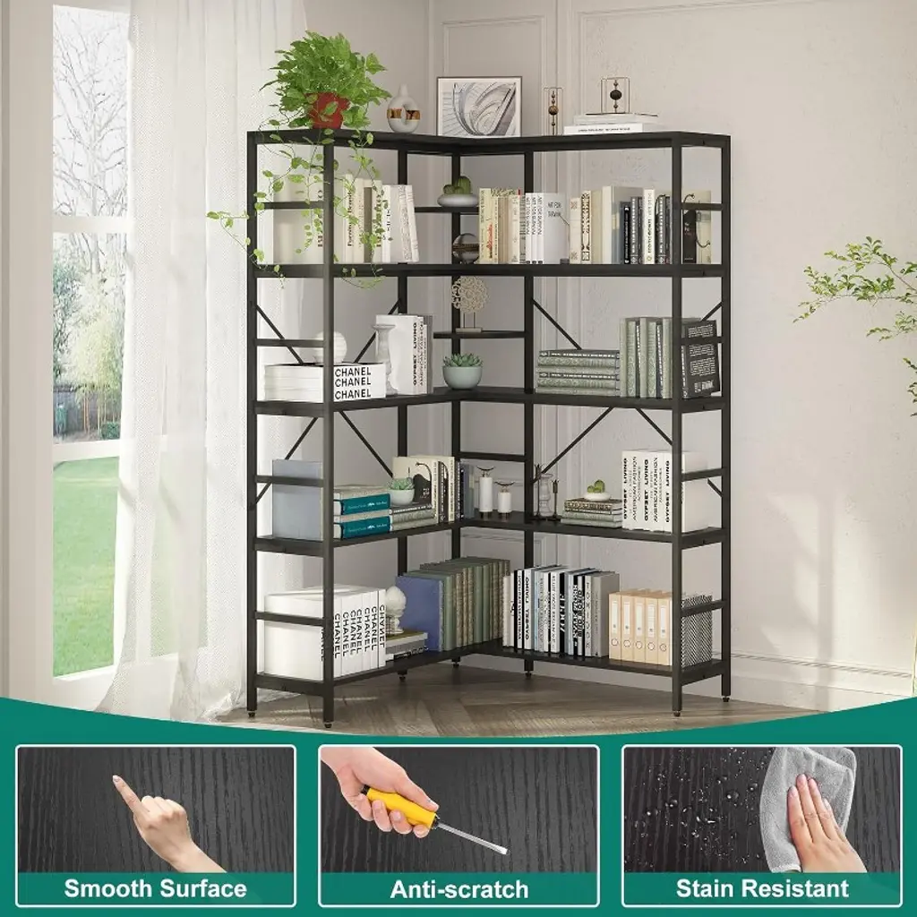 This industrial-style L-shaped bookshelf maximizes corner space with 10 open shelves (69.5"H) for books, decor, and storage baskets. Built with a reinforced metal frame and X-bar supports, it offers wobble-free stability on uneven floors. The 90° corner design (42.7"D/W) fits snugly while displaying collections elegantly. Easy assembly with labeled parts – perfect for living rooms, offices, or tight spaces.