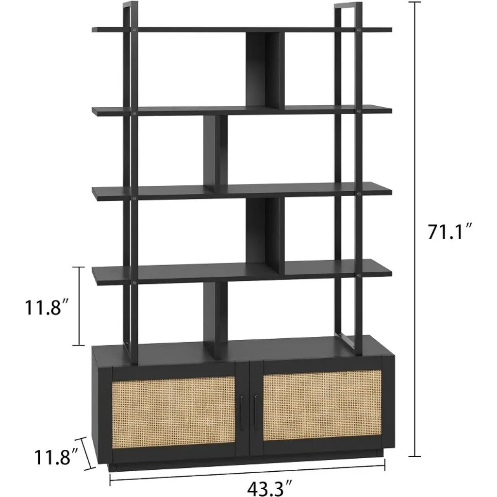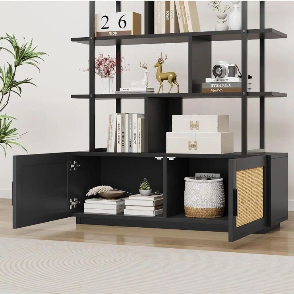 5 Tier Rattan Bookcase With Storage Cabinet, Open Display Shelf, Industrial Bookcase With Metal Frame For Living Room, Bedroom , Black