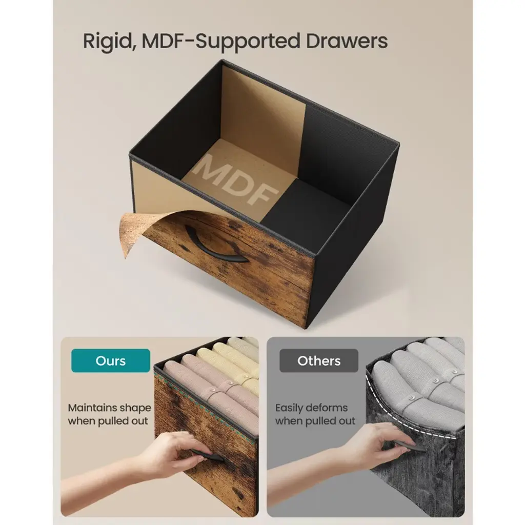 This multifunctional 7-drawer dresser features a sturdy steel frame and MDF-reinforced non-woven fabric drawers, serving as both a TV stand and storage organizer. The top surface supports up to 88 lbs, with large drawers holding 22 lbs and small drawers 11 lbs each. Designed for bedrooms, entryways, or closets, it includes adjustable feet for stability on uneven floors and an anti-tip kit for safety. The minimalist design offers easy assembly with included tools and instructions. Product Size: 11.8"D x 38.9"W x 29"H (30 x 98.8 x 73.7 cm) Product Weight: 25.3 lb (11.5 kg) Max. Static Load Capacity of the Top Surface: 88 lb (40 kg) Max. Static Load Capacity of Each Small Drawer: 11 lb (5 kg) Max. Static Load Capacity of Each Large Drawer: 22 lb (10 kg)