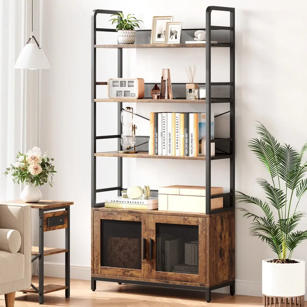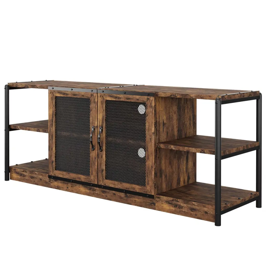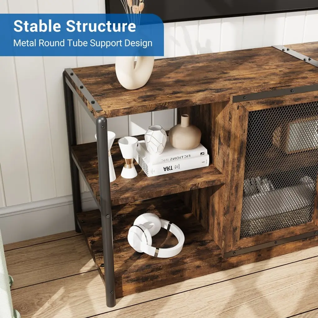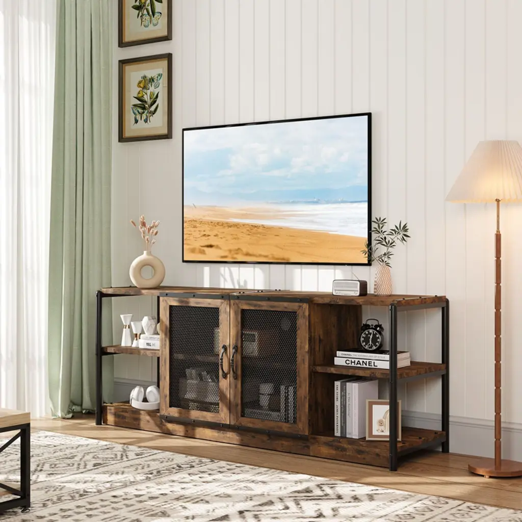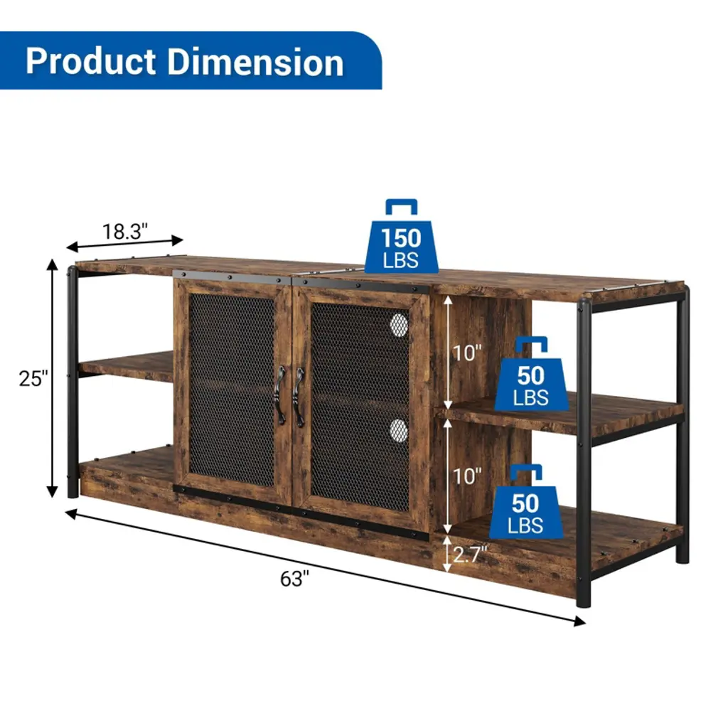 Feature:Cable management design: The farmhouse TV console table features cable management holes at the back, allowing you to neatly store any excess cables and effectively conceal clutter.Built to last: The surface of the wooden panels is waterproof, corrosion-resistant, and smooth, making it easy to clean. The iron pipes are powder-coated to prevent rust, ensuring long-lasting durability. Both metal handles and metal hinges are highly resistant to wear and tear, ensuring a long lifespan for reliable use.2 wire mesh door design: Wire mesh doors can complement a variety of architectural styles, adding a modern touch to homes. While allowing visibility and ventilation, wire mesh doors also allow you to hide or reveal items freely, and flexibly divide it into different storage and display area. Specification:Size: 63x18.3x25 inchColor: rustic brownMaterial: engineered wood + metal Package dimension: 35.63x18.11x9.65 inch Package weight: 78.82 lbs Note:Please carefully read the following instructions and caution warnings before assembling the product. Packing list:TV stand x1Hardware bags Assembly guide x1