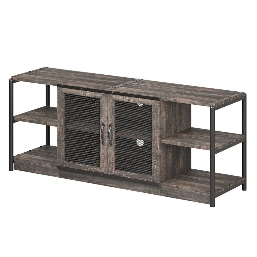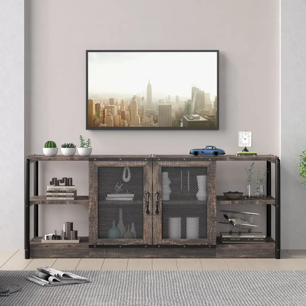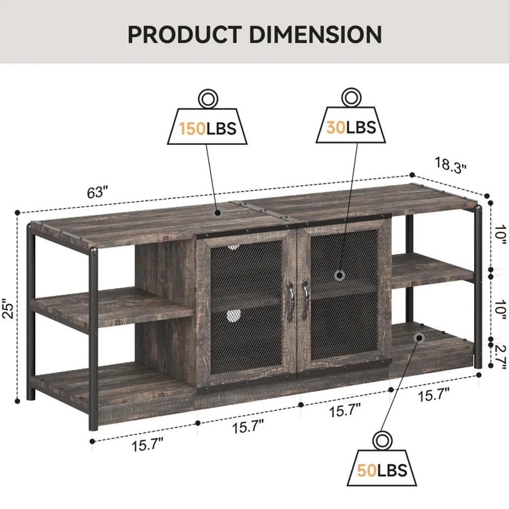 Feature:Cable management design: The farmhouse TV console table features cable management holes at the back, allowing you to neatly store any excess cables and effectively conceal clutter.Built to last: The surface of the wooden panels is waterproof, corrosion-resistant, and smooth, making it easy to clean. The iron pipes are powder-coated to prevent rust, ensuring long-lasting durability. Both metal handles and metal hinges are highly resistant to wear and tear, ensuring a long lifespan for reliable use.2 wire mesh door design: Wire mesh doors can complement a variety of architectural styles, adding a modern touch to homes. While allowing visibility and ventilation, wire mesh doors also allow you to hide or reveal items freely, and flexibly divide it into different storage and display area. Specification:Size: 63x18.3x25 inchColor: rustic oakMaterial: engineered wood + metal Package dimension: 35.63x18.11x9.65 inch Package weight: 78.82 lbs Note:Please carefully read the following instructions and caution warnings before assembling the product. Packing list:TV stand x1Hardware bags Assembly guide x1