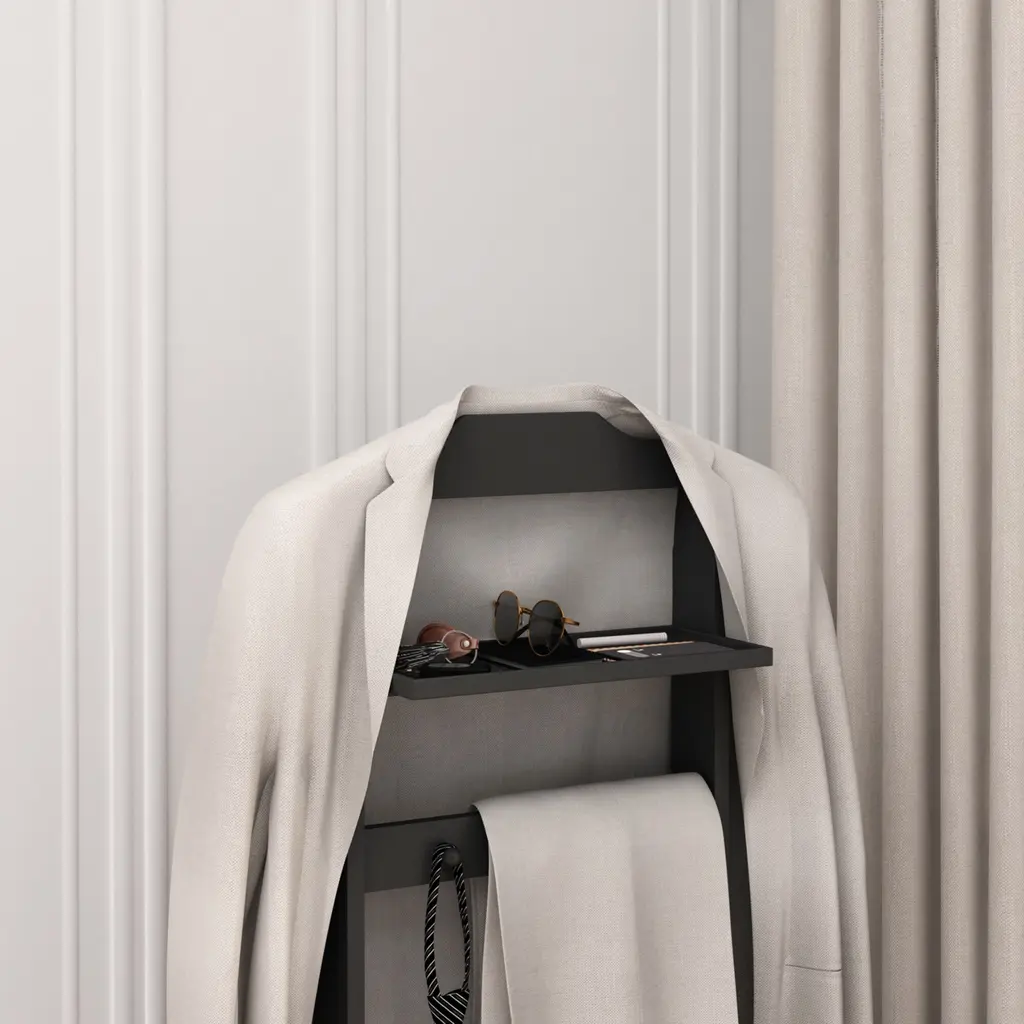Description: Experience the art of organization with our all-in-one solution. Our suit stand is designed to streamline your daily routine, offering a top tray for essential items like your phone, watches, wallet, keys, and more, while the lidded storage compartment keeps your jewelry and accessories secure and easily accessible.This stylish piece not only adds order to your life but also introduces extra storage space where you need it.Compact and elegant, this suit stand is the perfect addition to your home. Whether it's placed in your bedroom, entryway, or other small spaces, it serves as a versatile solution for organizing both men's and women's suits.Say goodbye to morning rushes and wrinkles as you can effortlessly prepare your outfit in a flash. The natural color complements Nordic-style rooms, while the vintage-style option is perfect for showcasing your jewelry and accessories.Crafted from high-quality wood, our suit stand boasts stability and durability, ensuring it serves you well for a long time to come.It's designed to suit both men and women and is exceptionally easy to assemble, even for those without prior installation experience. Elevate your daily routine with the perfect blend of style and functionality.Features: