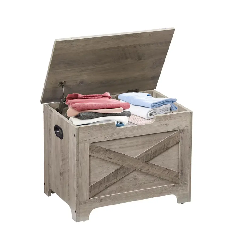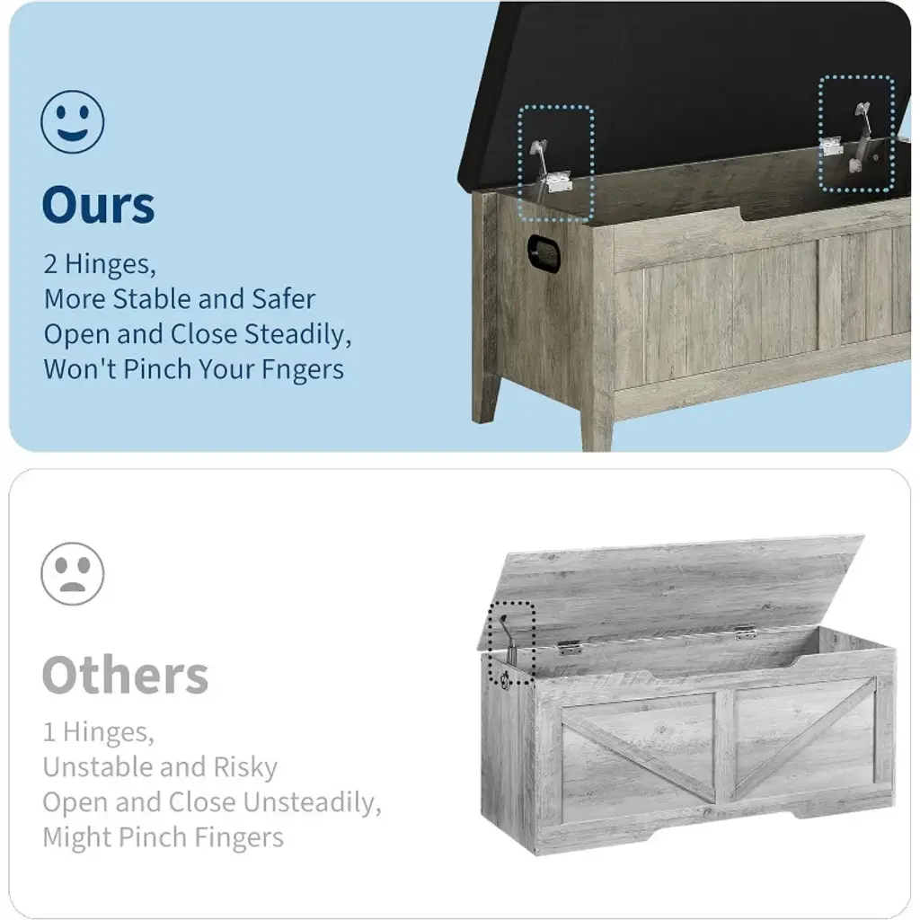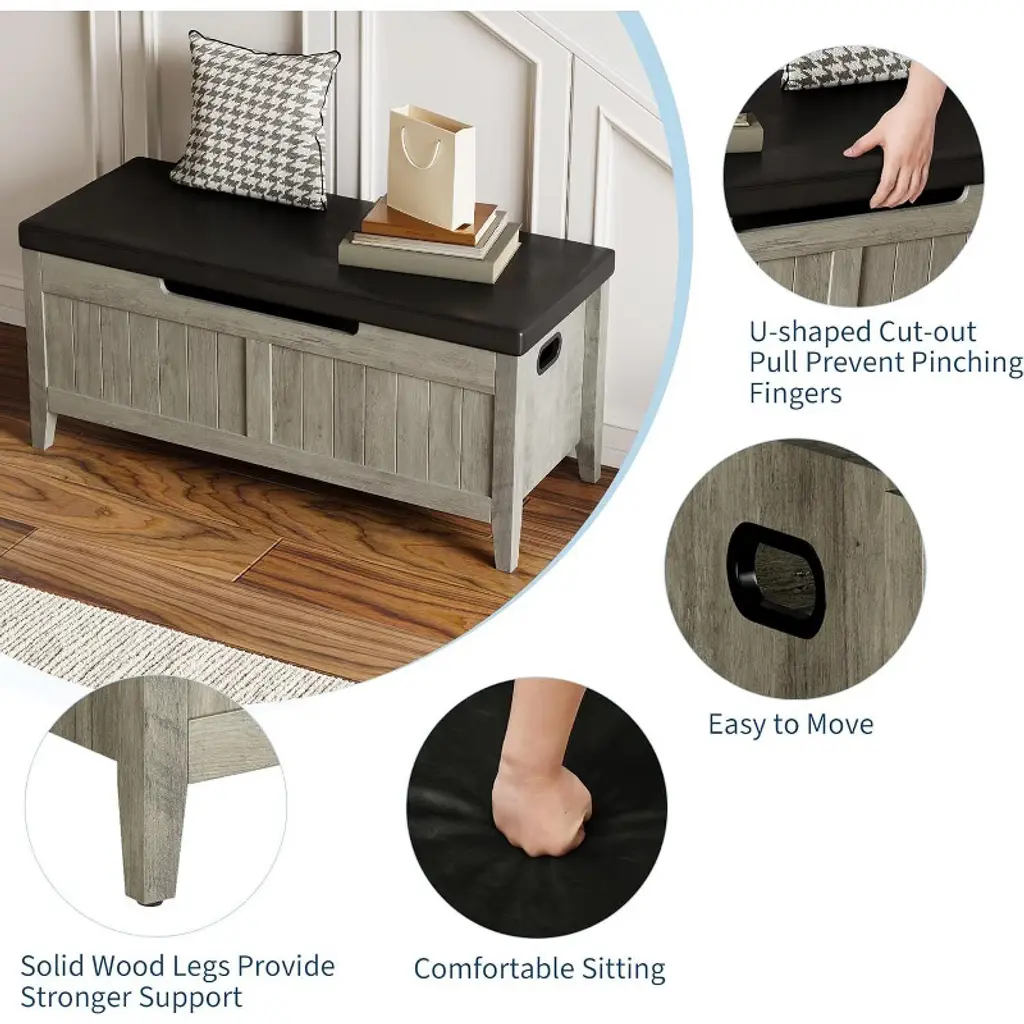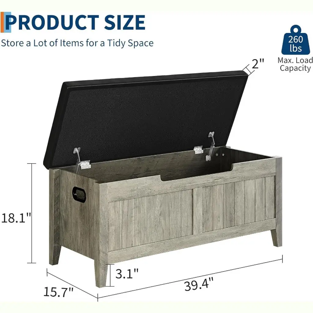 The Acekool Storage Bench offers ample space to tuck away bulky bedding, seasonal clothes, books, or everyday items, helping keep your home tidy and clutter-free. Its padded top provides comfy seating while the safety hinges prevent the lid from closing quickly, protecting your fingers and enhancing safety. Designed for easy relocation, the bench features ergonomic cut-out side handles that make moving it simple in bedrooms, entryways, and living rooms. Built with reinforced engineered wood panels that support up to 260 lbs, this bench balances style and function. Measuring 39" long by 16" wide and 19" high, this bench fits well in many rooms, offering generous storage without taking up too much floor space