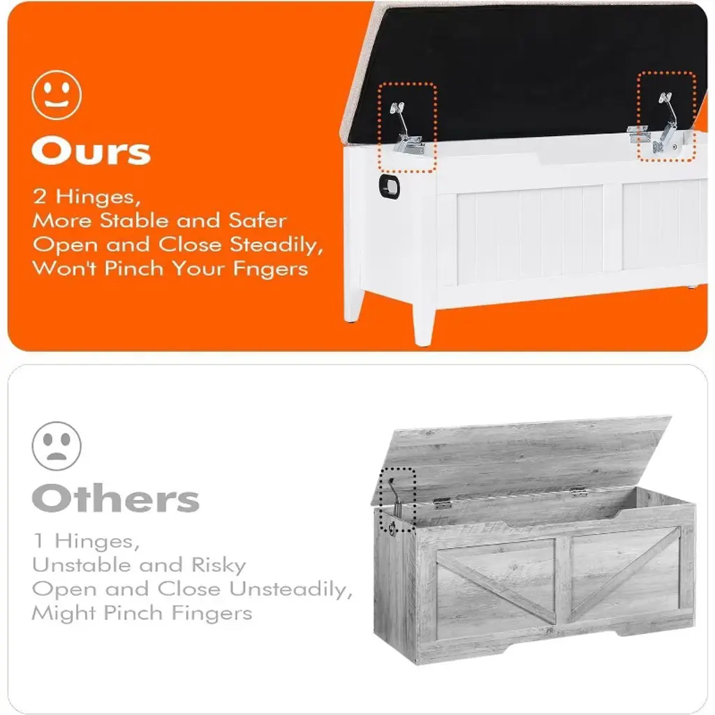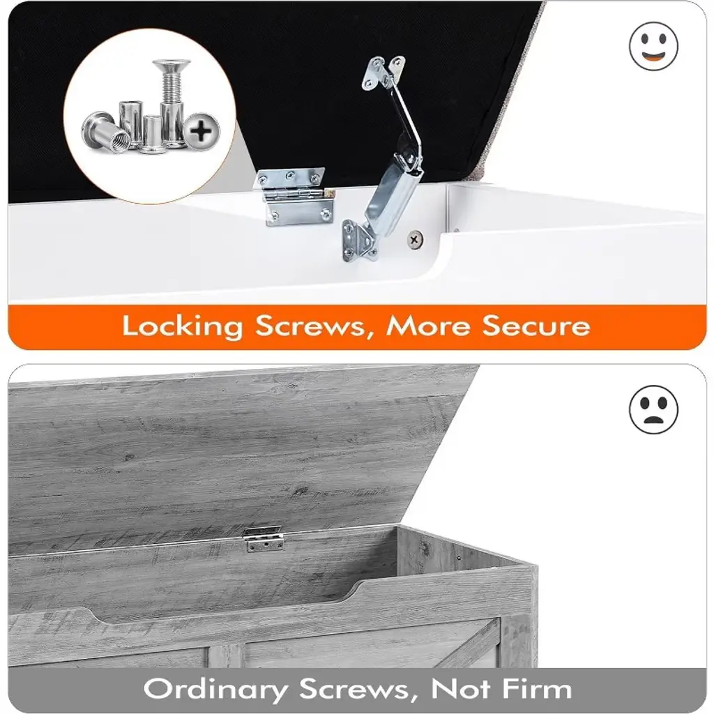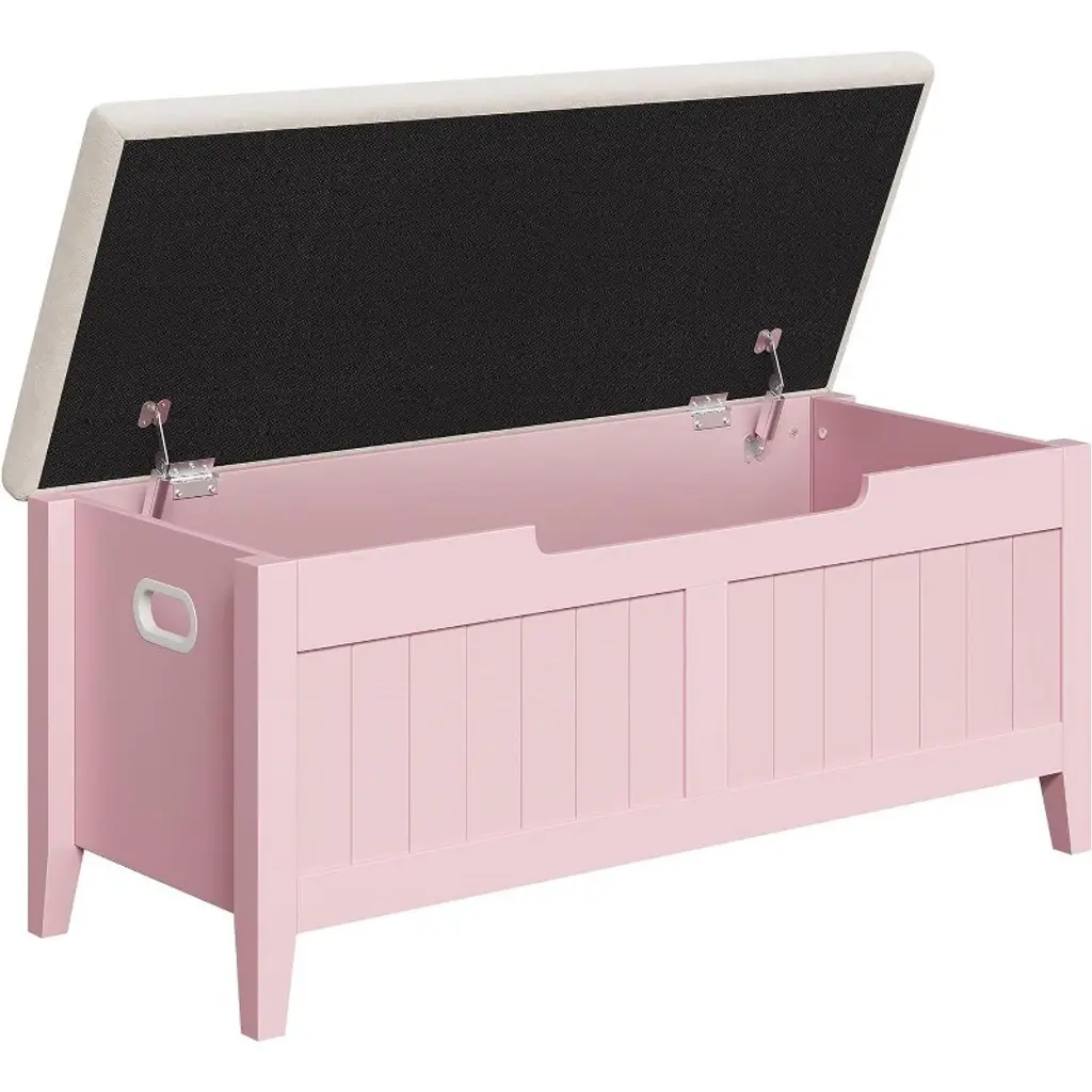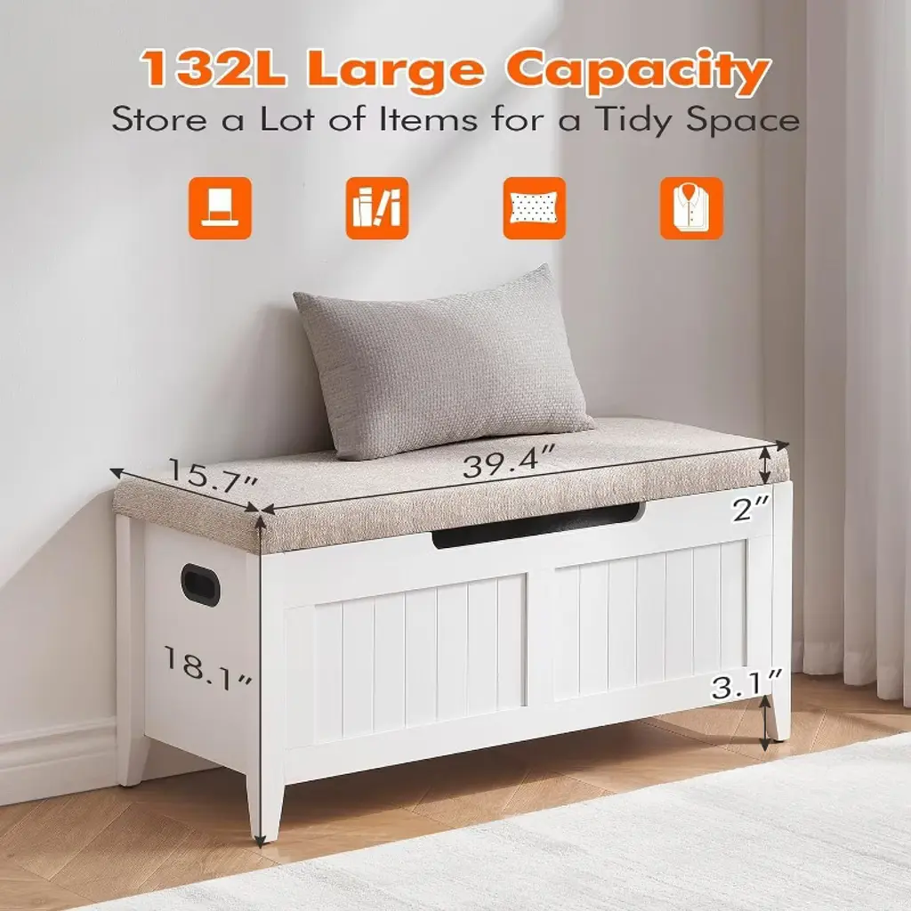 The Acekool Storage Bench offers ample space to tuck away bulky bedding, seasonal clothes, books, or everyday items, helping keep your home tidy and clutter-free. Its padded top provides comfy seating while the safety hinges prevent the lid from closing quickly, protecting your fingers and enhancing safety. Designed for easy relocation, the bench features ergonomic cut-out side handles that make moving it simple in bedrooms, entryways, and living rooms. Built with reinforced engineered wood panels that support up to 260 lbs, this bench balances style and function. Measuring 39" long by 16" wide and 19" high, this bench fits well in many rooms, offering generous storage without taking up too much floor space