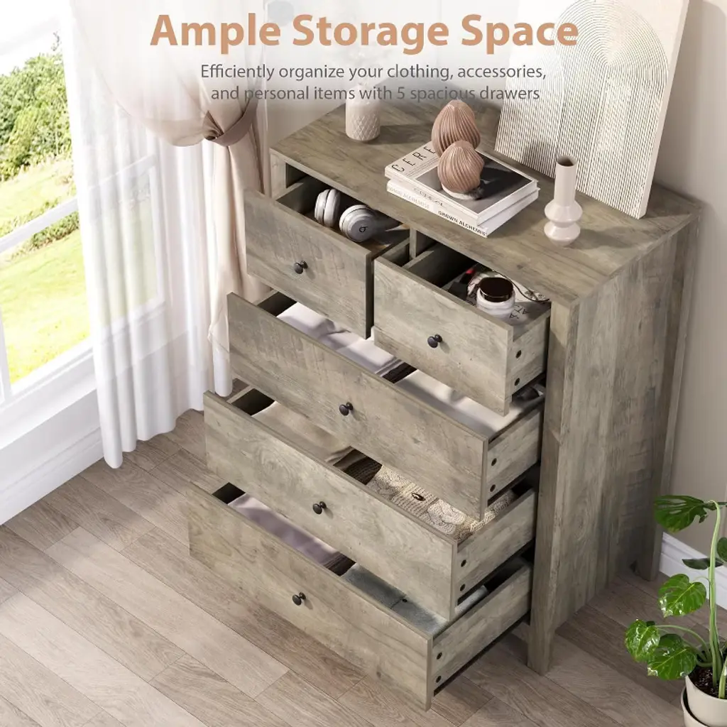 Acekool Grey 37" Tall 5-drawer Dresser, Deep Storage, Metal Knobs, Modern Wood Chest For Bedroom Entryway