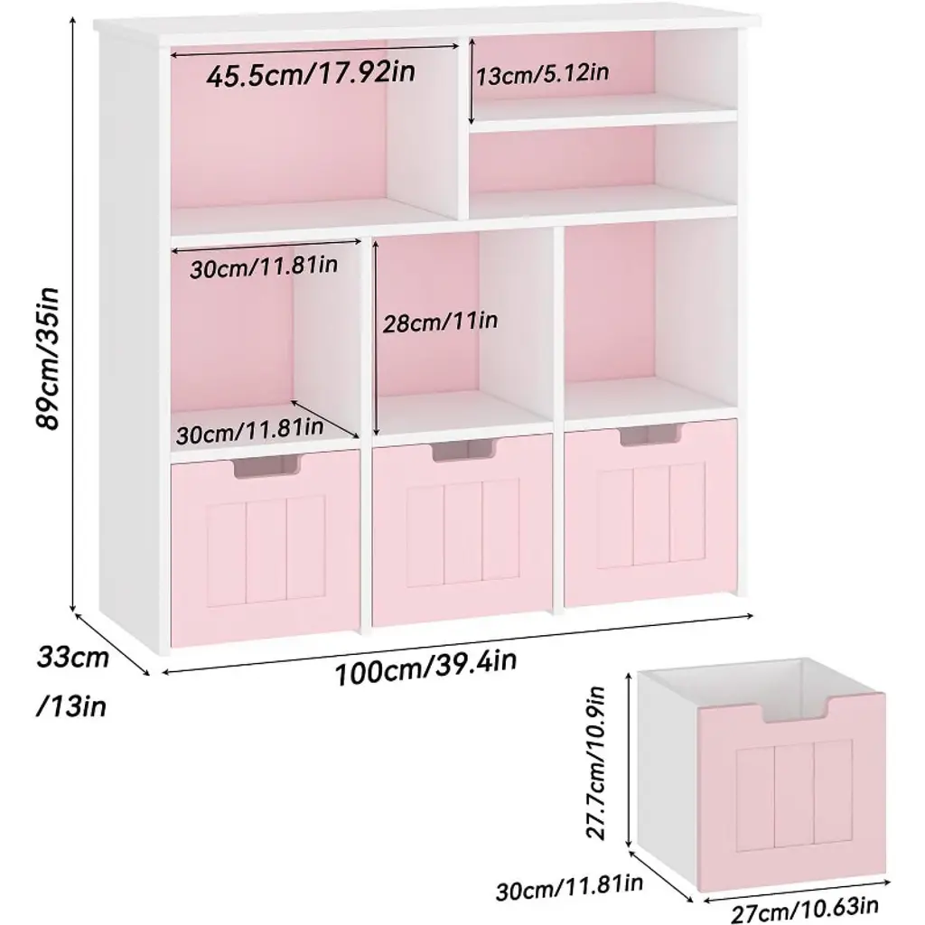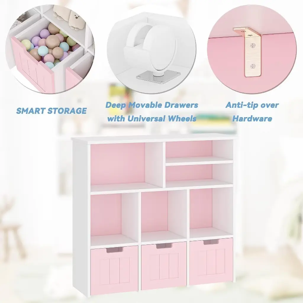 Acekool Toy Storage Cabinet For Kids, Organizer Shelf With 3 Removable Drawers & 6 Cubbies, Bookcase With Hidden Wheels For Bedroom & Playroom