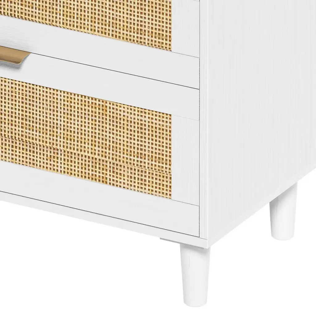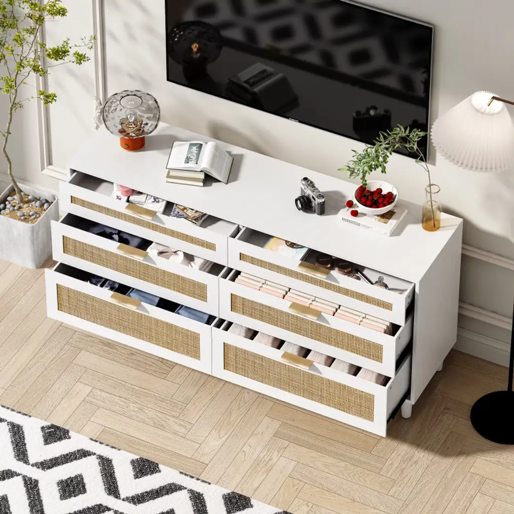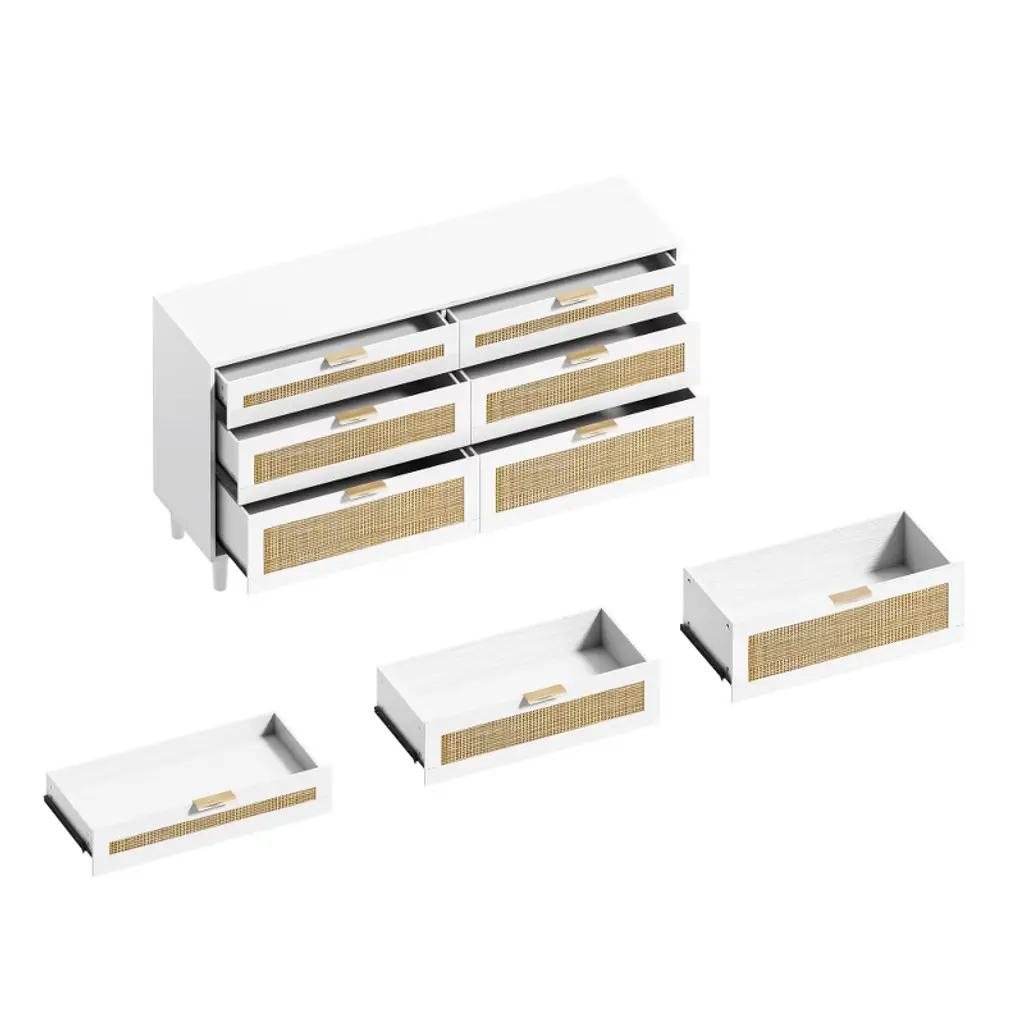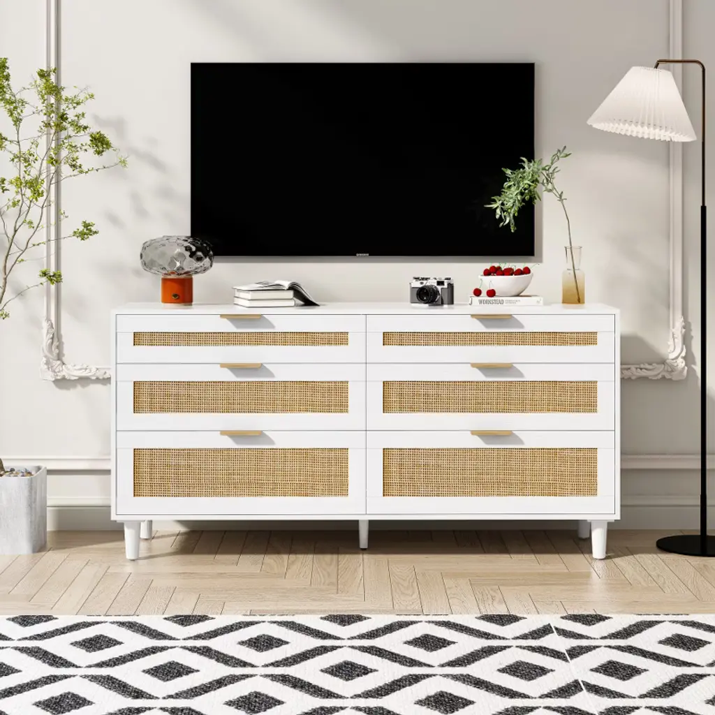 Alexoun 59" Rattan Dresser With 6 Drawers,clothes Storage Cabinet For Bedroom, Metal Handle & Wood Legs For Hallway, Living Room, Bedroom,white