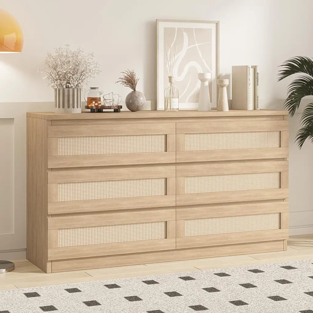 This dresser is functionally designed to meet a variety of storage needs. With 6 deep drawers of different sizes, the rattan dresser provides ample storage space for your daily use and keeps you organized. In addition, the smooth tabletop is the ideal place to display your favorite plants, pictures and decorative items.