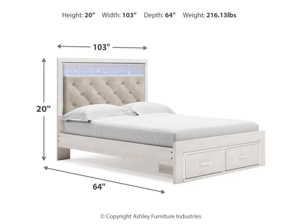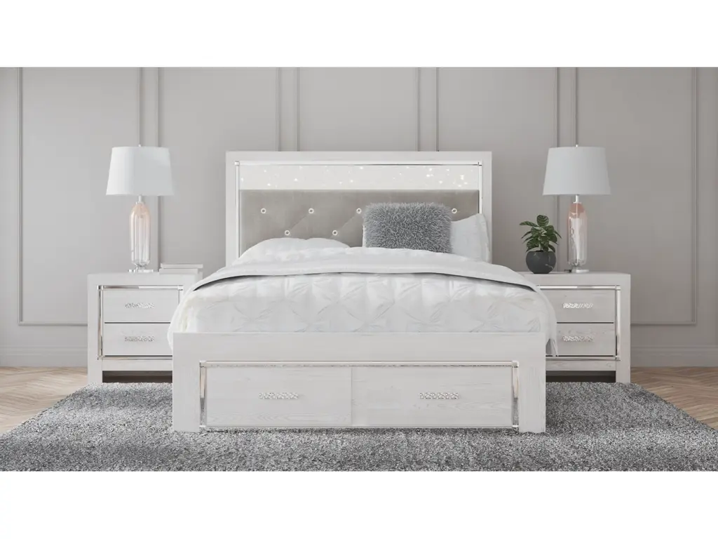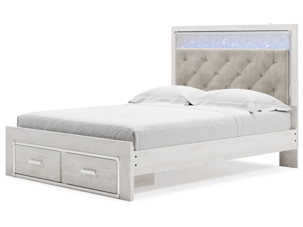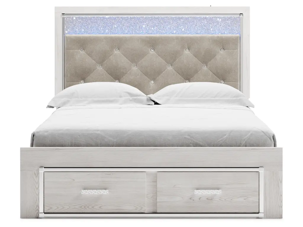 The epitome of fashion-forward design, the Altyra queen upholstered storage bed is a beautiful blend of comfort and luxury. Shiny chrome-tone accents, a pearlized finish and button-tufted upholstery bring a glam touch to the richly rustic appearance. Remote-controlled LED lighting adds style and modern convenience to your restful retreat.