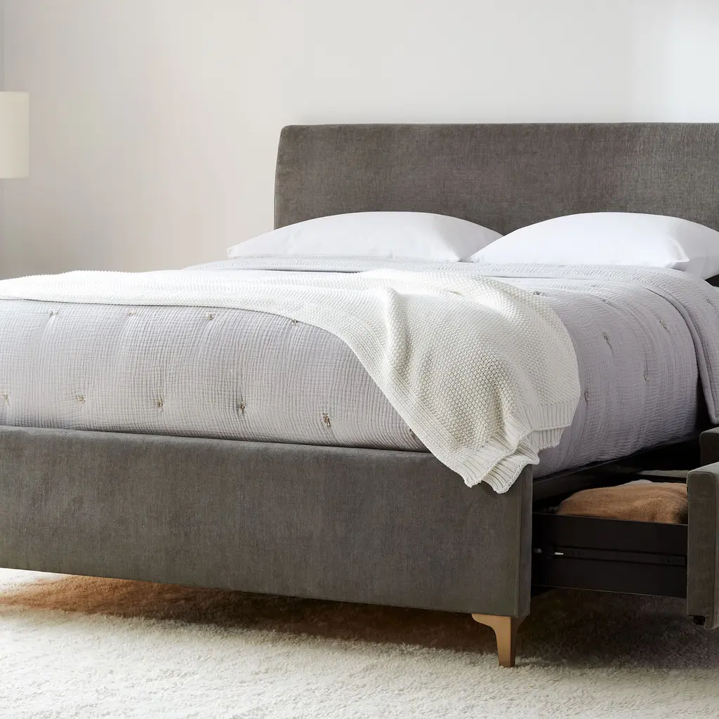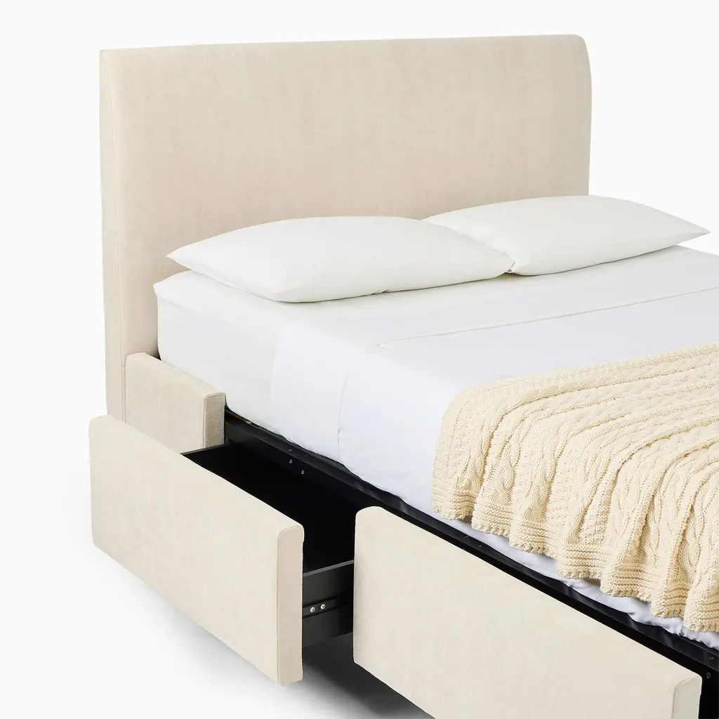 Designed by you: pick the height, tufting and legs. Plush, clean-lined headboard gives it a luxe look. Side drawers for discrete functional storage. Contract Grade for unmatched durability.