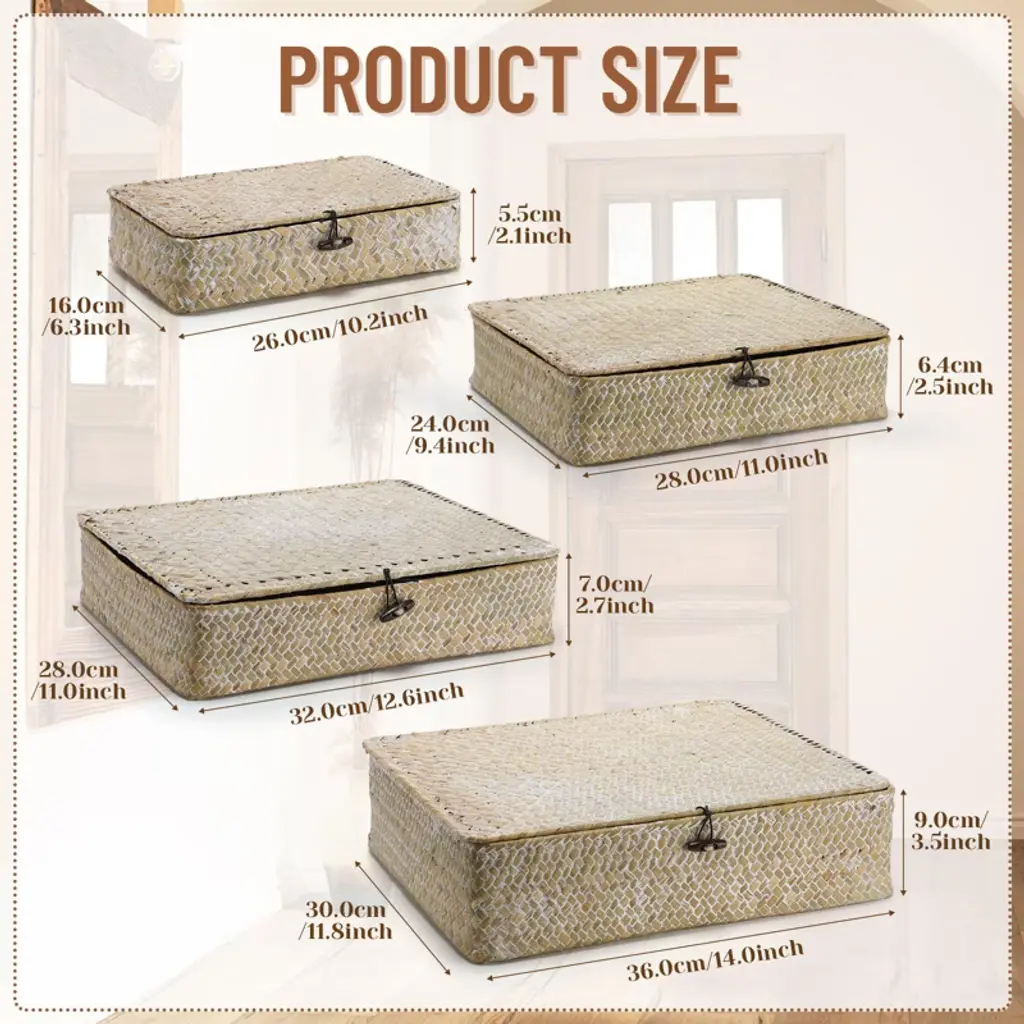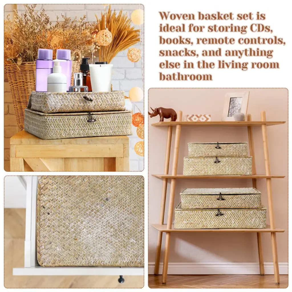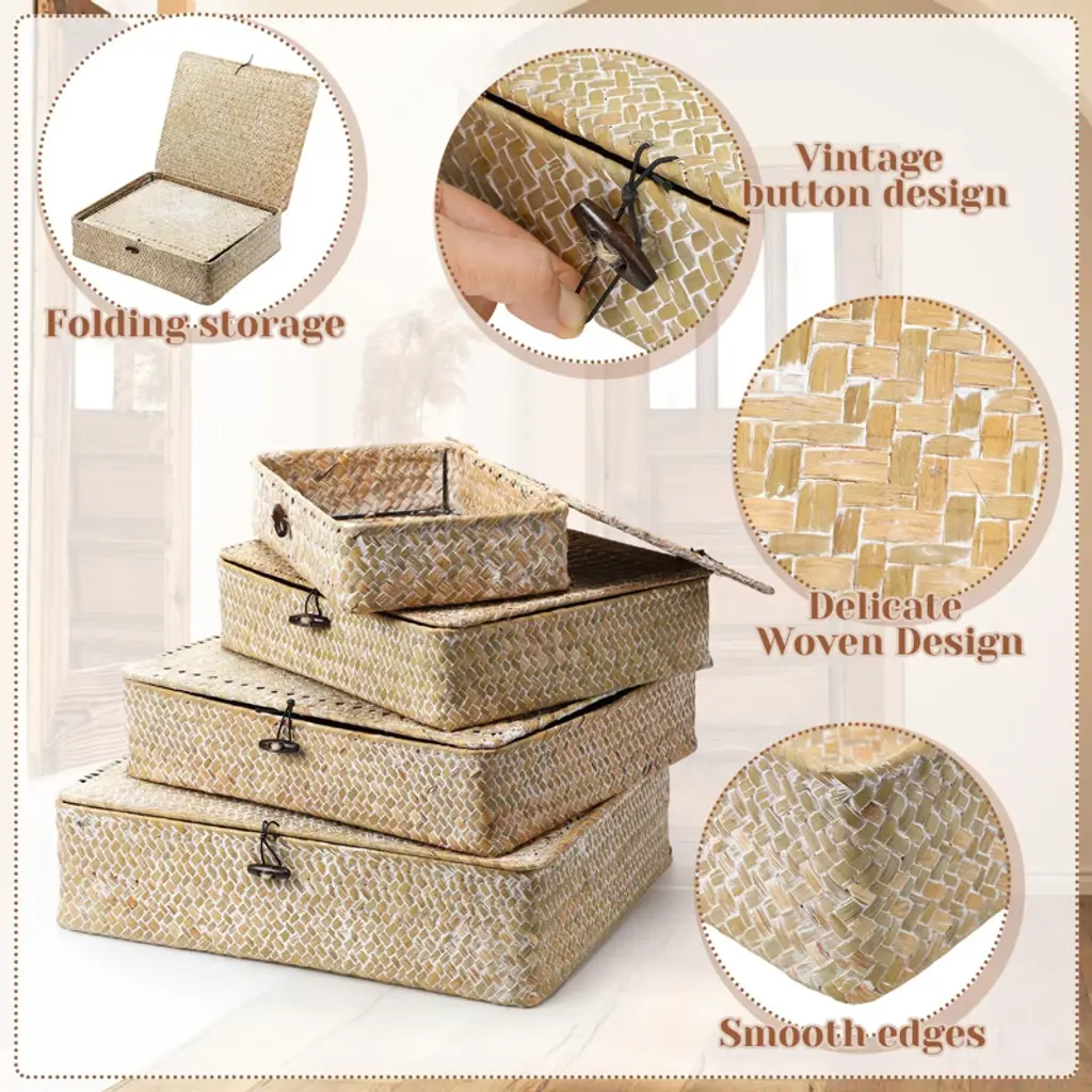Add rustic charm to your home while keeping everything organized with this set of four seagrass baskets in versatile sizes, perfect for shelves, countertops, and closets. Crafted from natural, lightweight yet sturdy seagrass, each basket features a convenient lid, stylish wood button closure, and secure strap to keep your essentials safely tucked away. Whether used in the living room, bedroom, kitchen, or bathroom, these storage boxes blend practicality with decorative appeal to beautifully elevate any space.