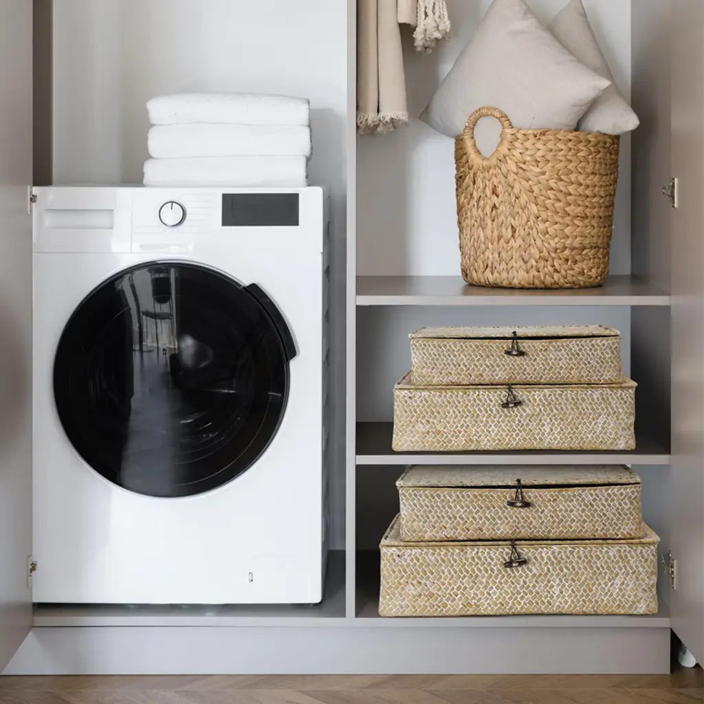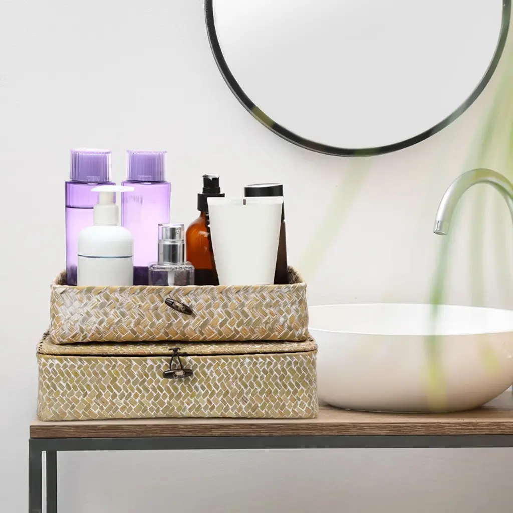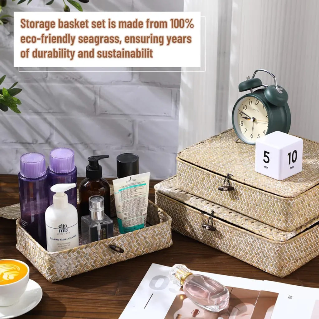 Add rustic charm to your home while keeping everything organized with this set of four seagrass baskets in versatile sizes, perfect for shelves, countertops, and closets. Crafted from natural, lightweight yet sturdy seagrass, each basket features a convenient lid, stylish wood button closure, and secure strap to keep your essentials safely tucked away. Whether used in the living room, bedroom, kitchen, or bathroom, these storage boxes blend practicality with decorative appeal to beautifully elevate any space.
