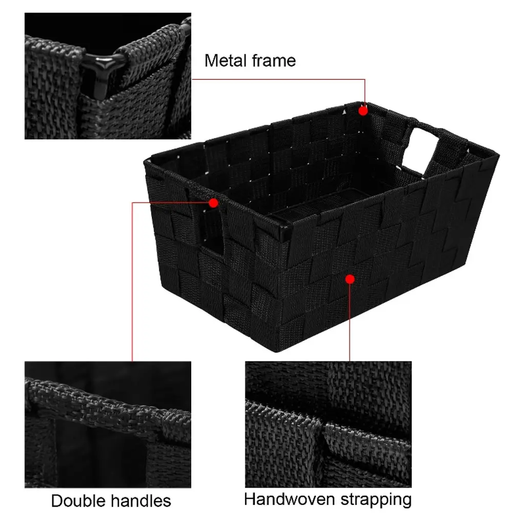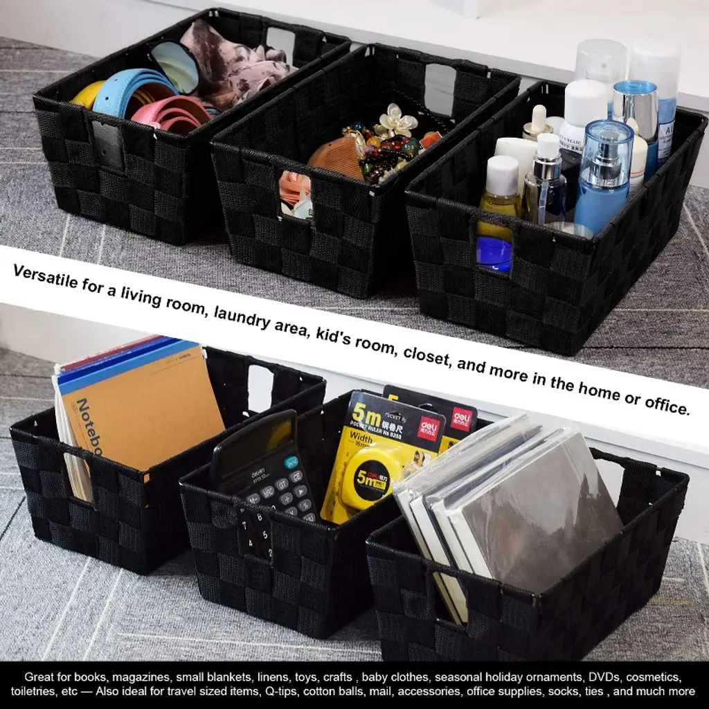 Upgrade your space with these durable woven black storage baskets, featuring steel wire frames for lasting strength and sleek organization. Built-in handles make moving and accessing your essentials effortless, whether in the bedroom, office, closet, or nursery. Perfectly sized to save space and versatile for everything from cosmetics to toys, these bins keep your home tidy and stylish for all ages.