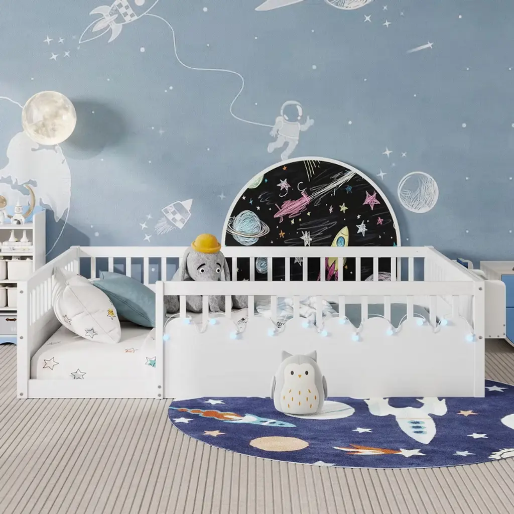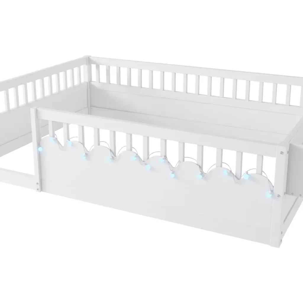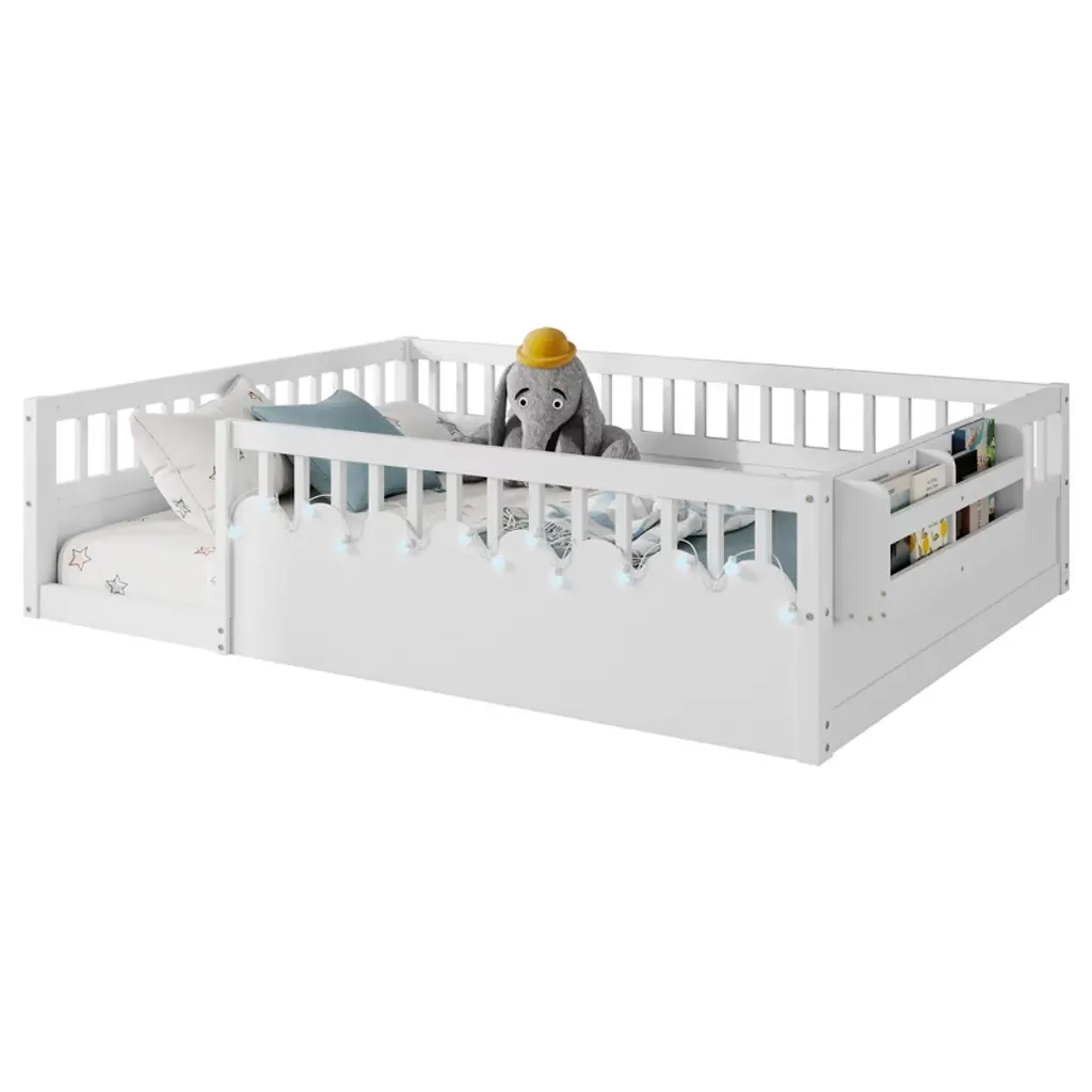Full Montessori Floor Bed Frame with High Rails, Wood Kids Floor Beds with Light and Storage Shelf This kids bed is a great helper for parents. The floor bed enables freedom of movement, independence, and mobility of the little one. The low bed profile allows your child to easily get in and out of bed, encouraging their sense of independence.
