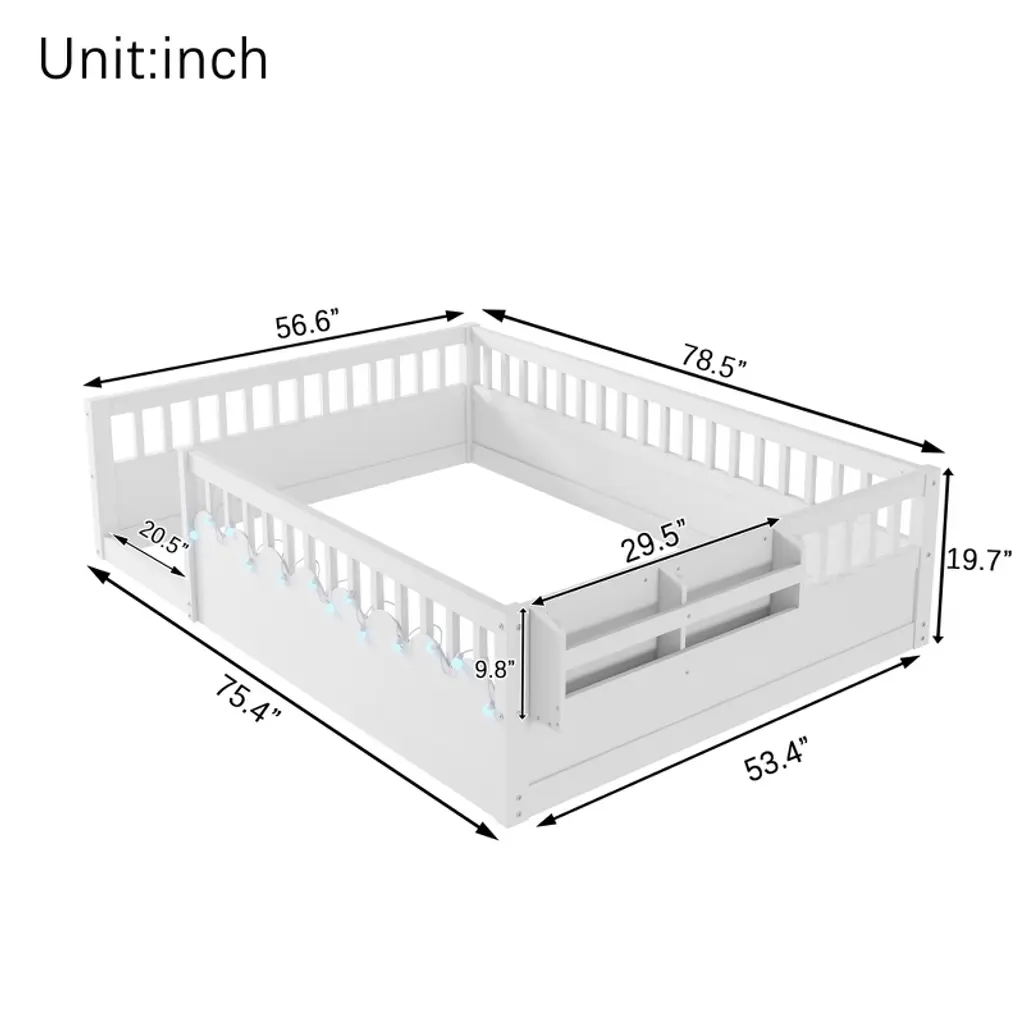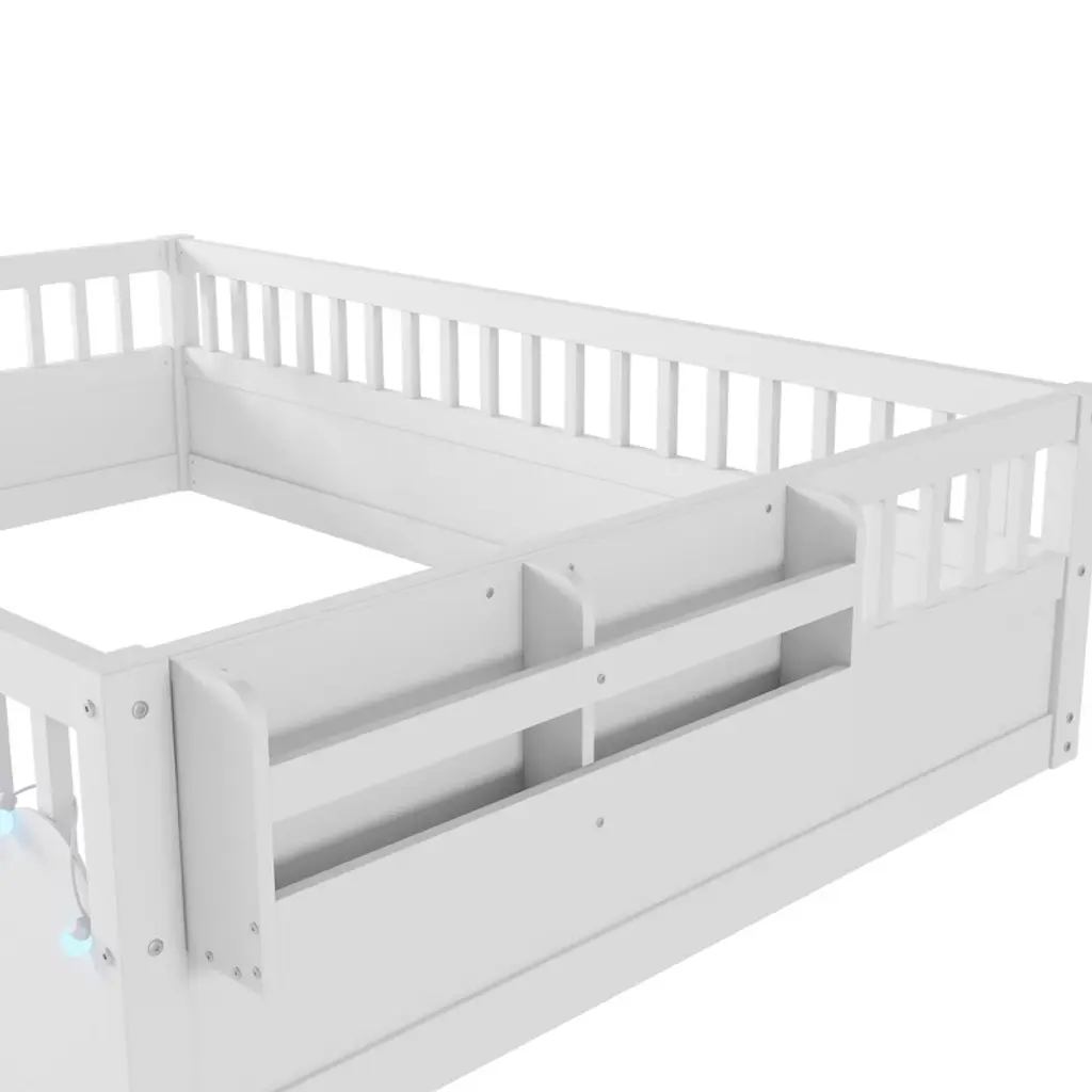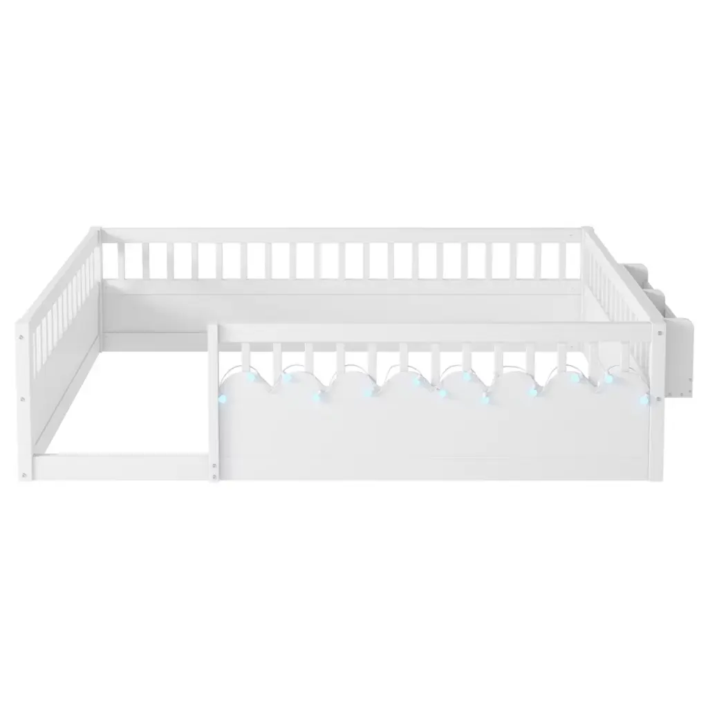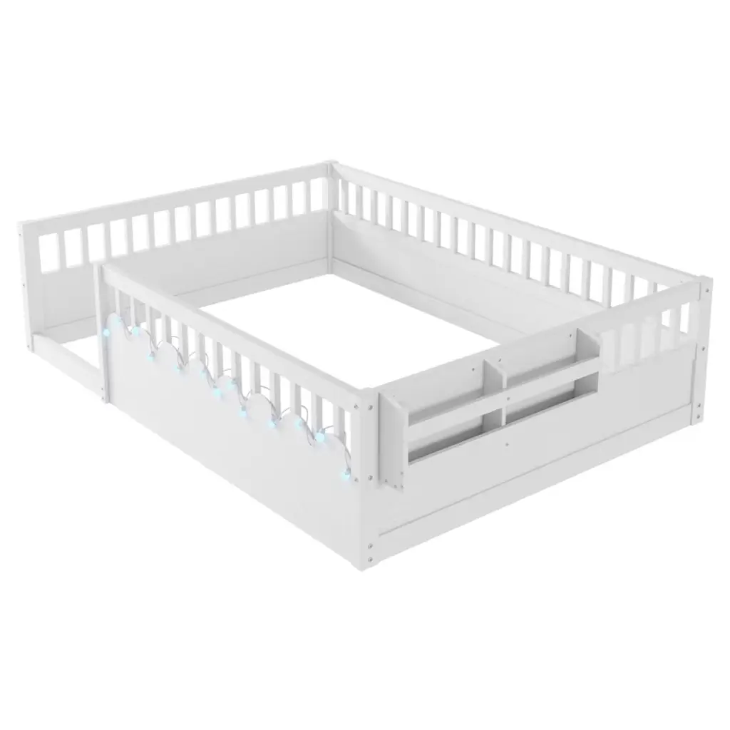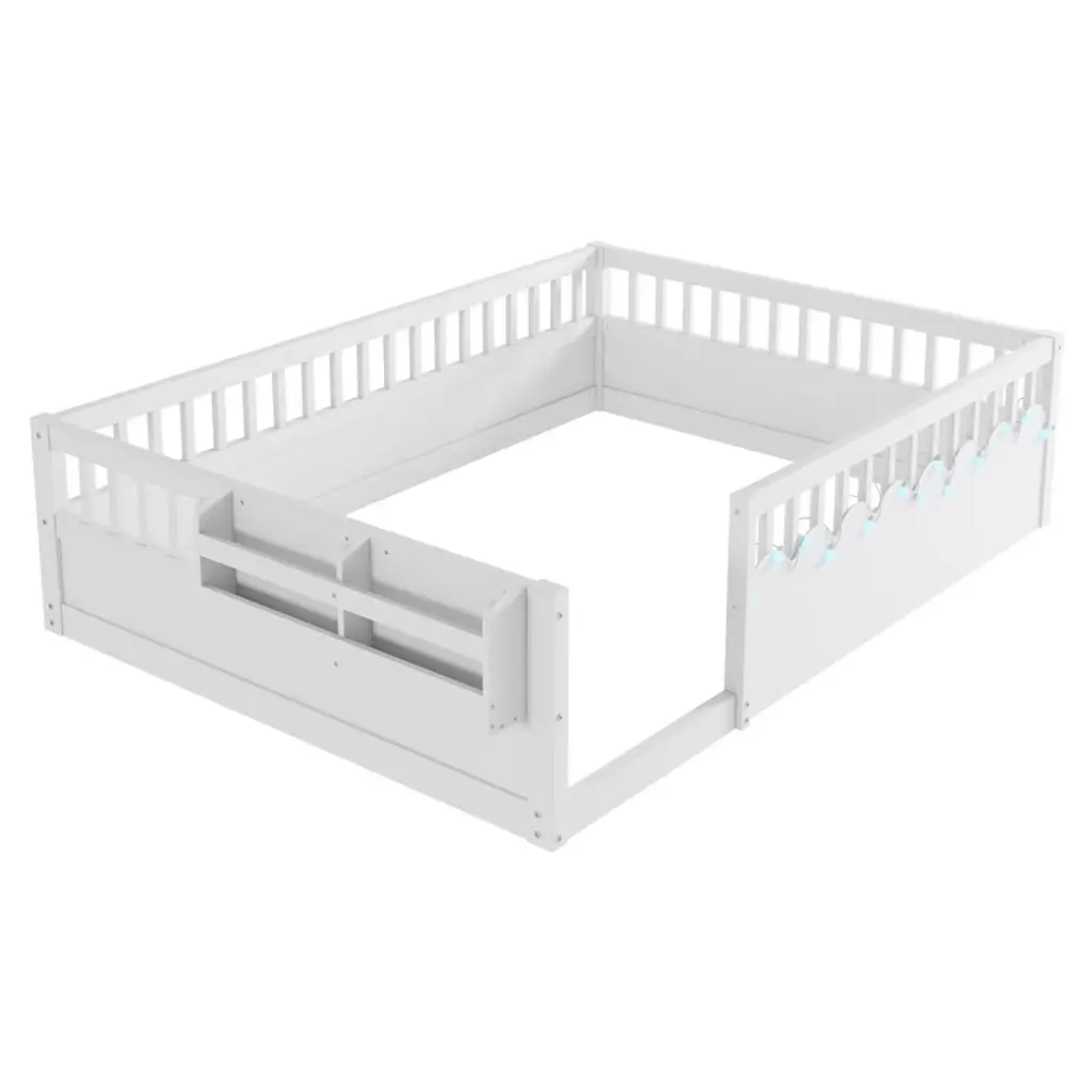Aprilsoul78.50"full Montessori Floor Bed Frame With High Rails, Wood Kids Floor Beds With Light And Storage Shelf, White