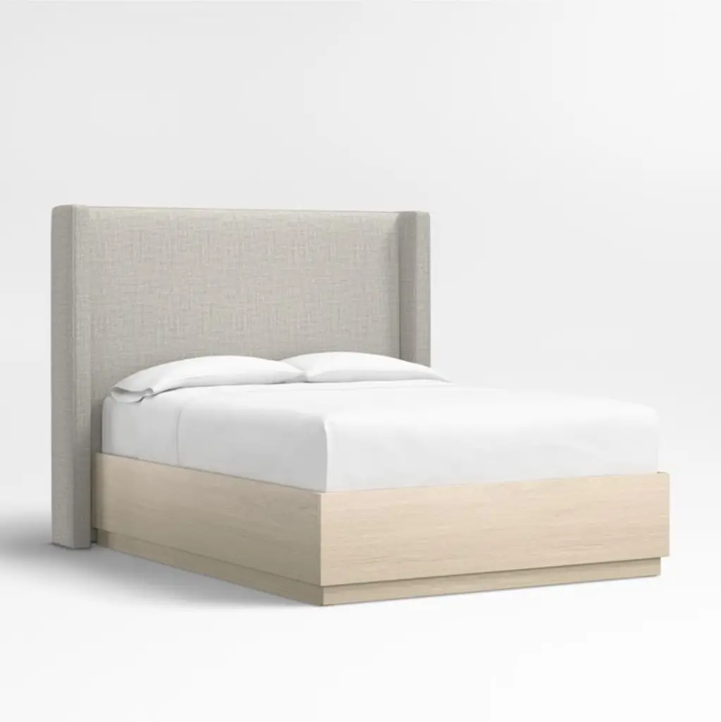 Our custom bed collection lets you mix and match our top-selling headboards and bases for a look that's truly yours. Upholstered in a misty grey textured weave with topstitched detailing, the Arden shelter headboard surrounds with wingback contours and comfy padding. The tall headboard wraps onto the Batten bed base, which complements Arden's tailored curves with a sleek plinth design and the lively grain of oak veneer enhanced with a light white oak finish. A great choice for storage-challenged bedrooms, Batten seamlessly integrates a drawer at the foot of the base for placing bedding, blankets and out-of-season garments.By choosing FSC ®-certified furniture, you are supporting responsible management of the world's forests.