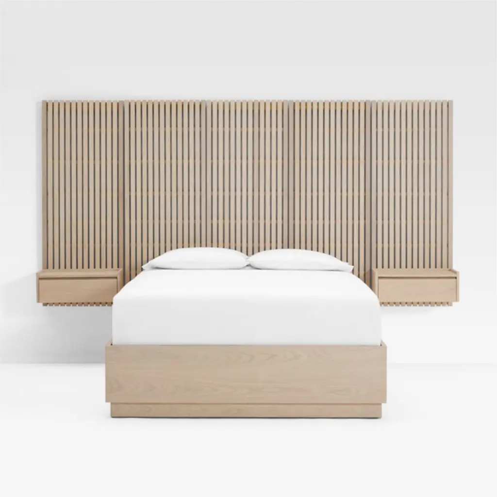 Part of our space-saving Batten modular storage system, slatted back panels make the perfect backdrop for a plinth-base storage bed and a pair of floating nightstands. Made of handsome oak veneer finished in white oak, the components come together in a customizable arrangement. Add on Batten shelves and hooks for more storage options. Designed by Bill Eastburn of William Eastburn Design, the Batten collection is a Crate & Barrel exclusive.
