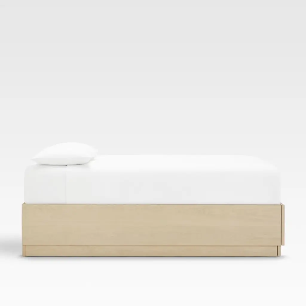 Designed to coordinate with our Batten modular system, this smart plinth-base storage bed showcases the grain of oak veneer with a white oak finish. A great choice for storage-challenged bedrooms, Batten provides a drawer at the foot of the bed for placing bedding, blankets and out-of-season garments. Handsome placed in front of one or two Batten back panels (sold separately), the minimalist bed also looks great on its own or paired up with any of the other headboards in our collection. The Batten bed is designed for us exclusively by Bill Eastburn of William Eastburn Design.