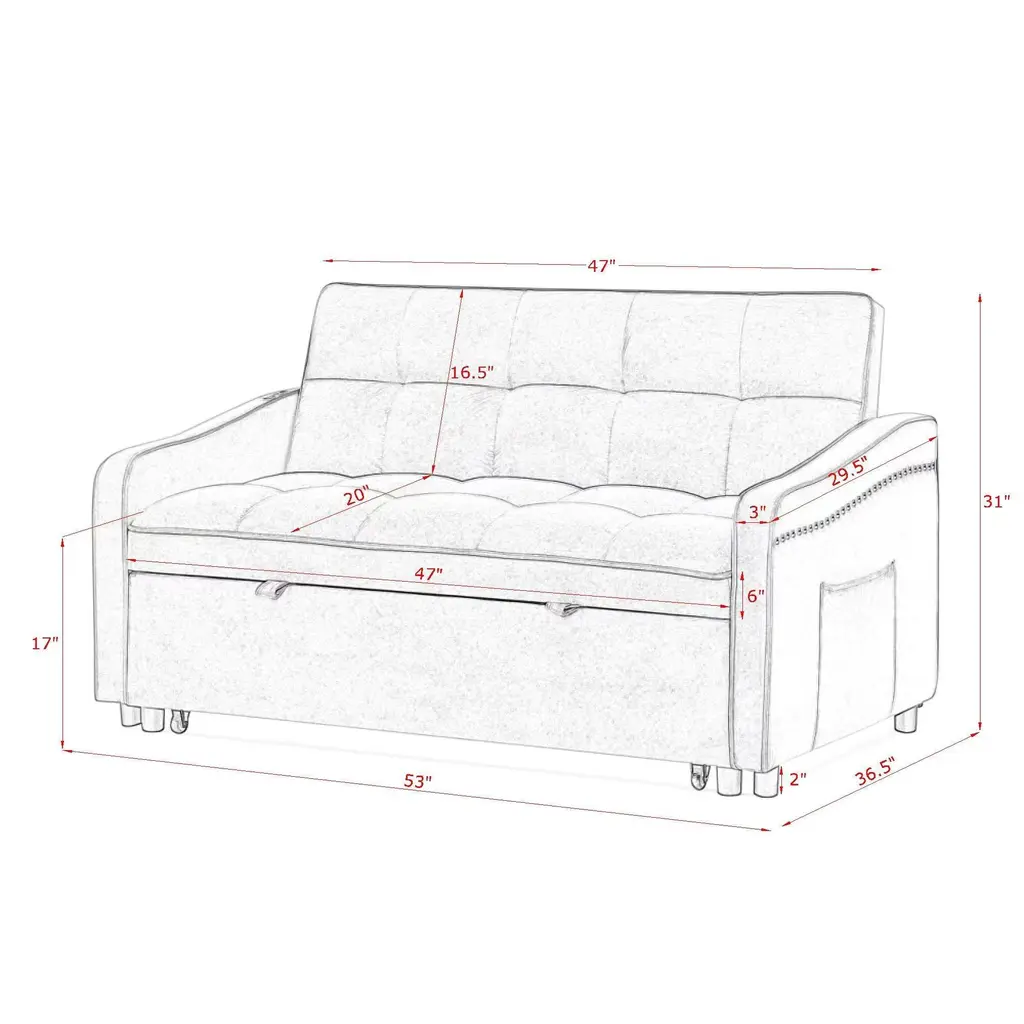 Description:Introducing our Mid-Century Style Double Sofa, a perfect fusion of timeless elegance and modern functionality. The sofa’s wavy armrests and copper nail detailing provide a sophisticated touch that enhances any decor. Transform your space effortlessly with the versatile pull-out bed feature, ideal for accommodating guests or children. Designed with convenience in mind, this sofa includes USB and Type-C charging ports for seamless device connectivity, and side storage pockets to keep essentials within reach. The adjustable backrest offers three reclining positions, ensuring comfort whether you’re lounging, reading, or napping. Perfect for living rooms, bedrooms, dorms, and apartments, this multifunctional sofa effortlessly fits into any setting.Features:Specifications:Product Type: Loveseat/Sofa BedUpholstery Material: VelvetFrame Material: Solid Wood + Faux WoodFrame Material Details: Solid Wood and PlywoodLeg Material: PlasticSeat Filling Material: FoamSeat Structure: Bending SpringBack Filling Material: FoamDimensions:Overall Sofa Length: 47" x 53" x 31"Sleeper Dimensions: 69" x 45" x 16.5"Back Height - Seat to Top of Back 16.5"Arm Height - Floor to Arm:22.5"Seat Height - Floor to Seat:17"Leg Height - Top to Bottom: 2"Cushion Thickness: 6"Net Product Weight: 112 lbsPackaging Weight: 115 lbsWeight Capacity: 250 lbs/Seat
