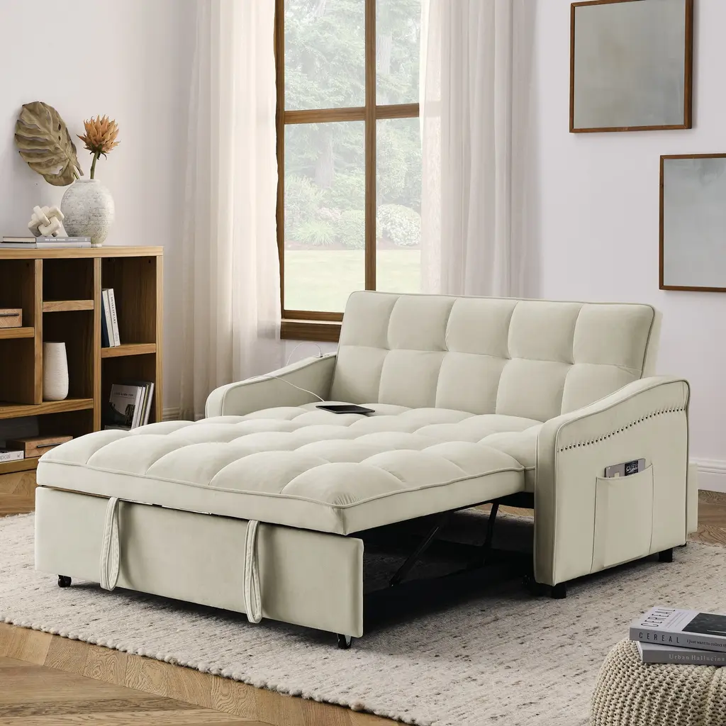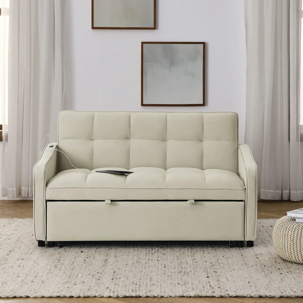 Beige Sleeper Loveseat W/ Pull-Out Bed, Adjustable Backrest, Two Storage Pockets, Lounge Chair W/ Type-C And Usb Charging Ports - Beige