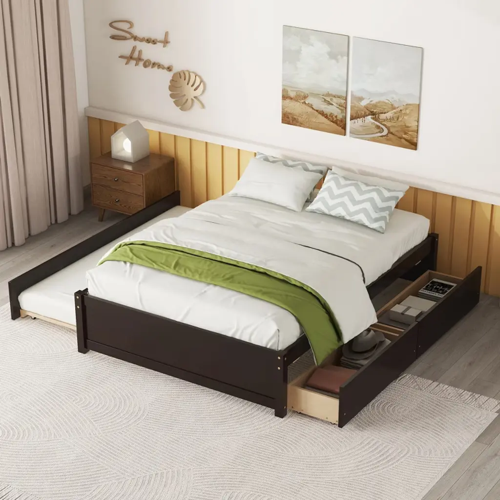 This full size trundle bed take advantage of additional sleeping space without losing a sense of modern style, make you children or guests have a comfortable sleep experience.The tundle bed full is equipped with 2 capacious drawers and trundle,this design fully explores the options to optimize space-saving.