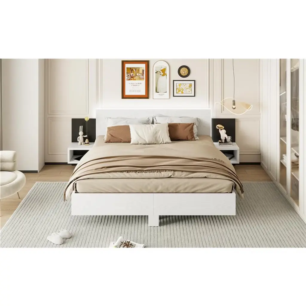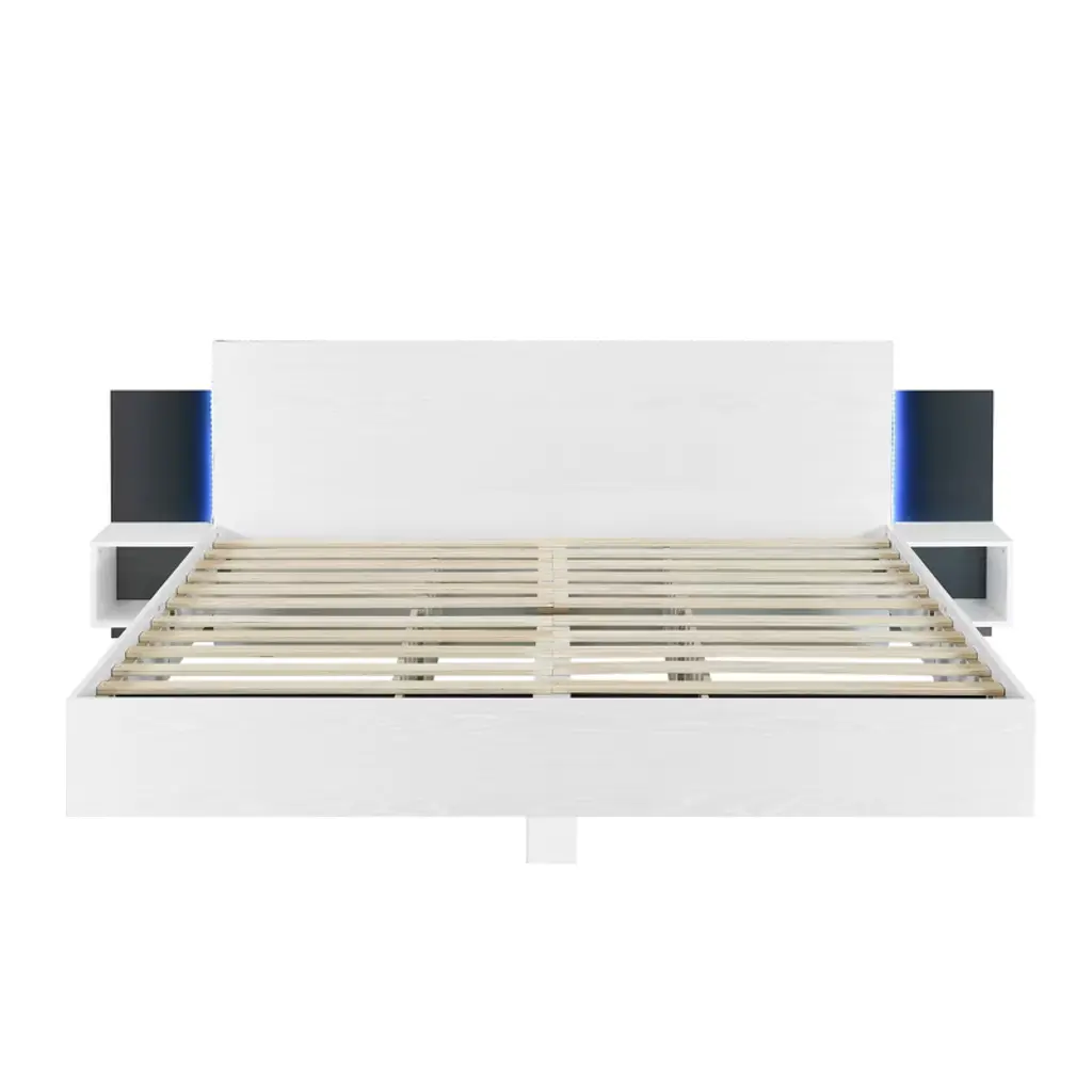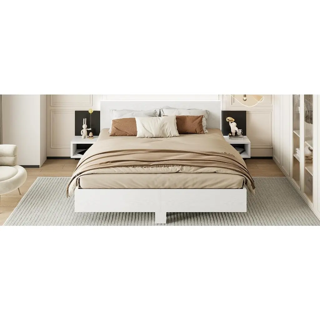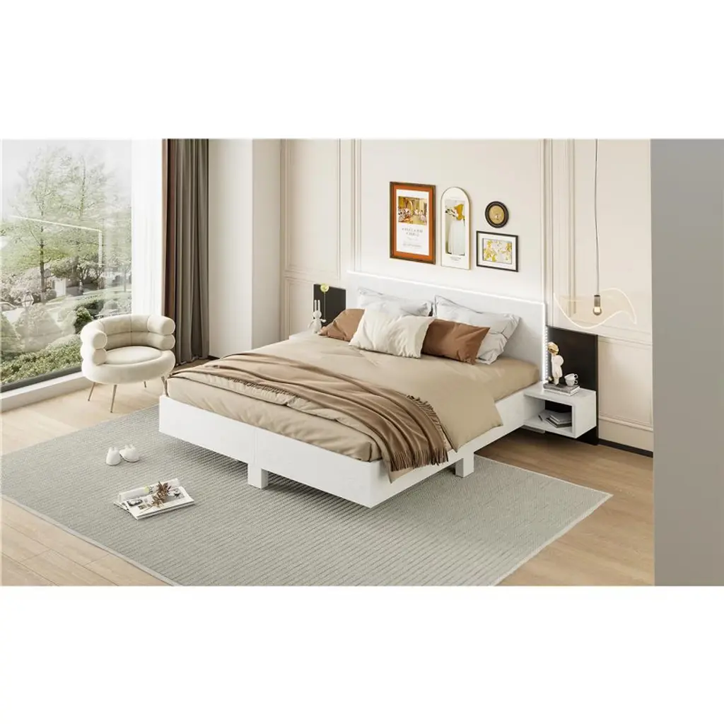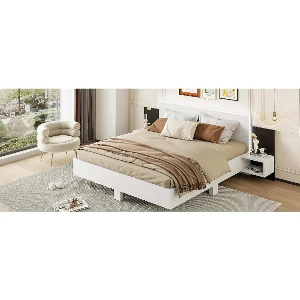 This floating platform bed is the perfect centerpiece for modern bedrooms, offering the ideal balance of style, functionality, and comfort. Available in Queen and King sizes, this bed features a unique floating design that adds a modern, spacious feel to any room. The headboard is equipped with an integrated LED light strip, creating a soft, ambient glow that enhances the cozy atmosphere and makes nighttime reading or relaxing even more enjoyable. On each side, you'll find built-in nightstands, offering convenient storage and display for your bedtime essentials. The bed’s surface is finished with natural wood grain stickers, providing the elegant look of real wood while offering a durable and low-maintenance solution. With multiple color options to suit any interior style, this platform bed is built with sturdy, high-quality materials to ensure long-lasting comfort and support.