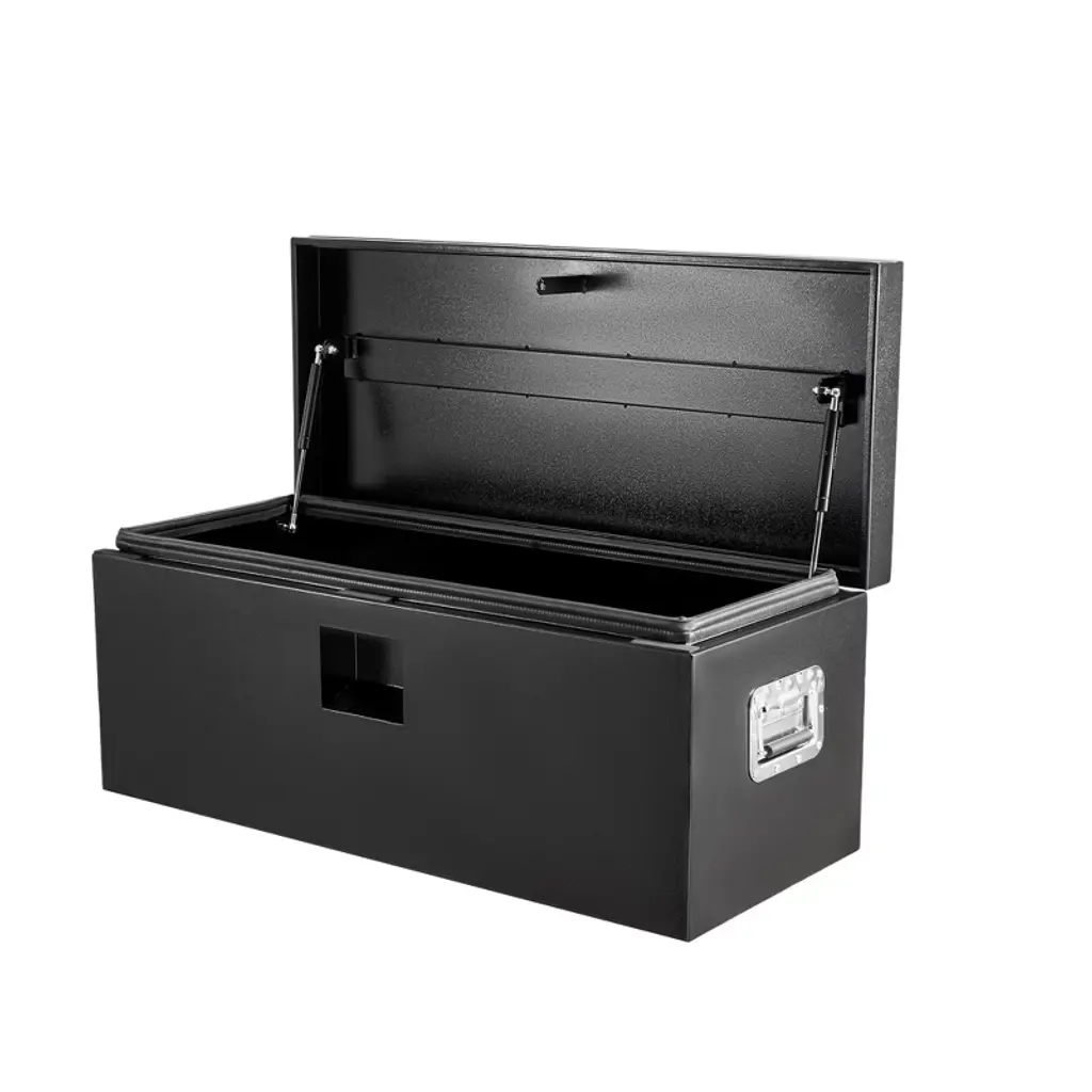 Heavy-Duty Hitch Mount Tool Box, Rust Resistant Steel with Weatherproof SealProduct Details:Commercial-Grade Steel ConstructionBuilt to withstand the toughest conditions, this toolbox is constructed from durable 12-gauge steel. It features a textured black powder coat finish that provides superior rust resistance, ensuring it far outlasts plastic or aluminum alternatives when exposed to extreme heat, freezing temperatures, and heavy daily use.Quick-Access, Open-Design StorageDesigned for efficiency, this modern-style toolbox features a no-lock, easy-open design perfect for contractors who need instant access to their tools. The open design is also ideal for tailgating or camping, allowing for quick retrieval of coolers and gear. For added security, it is equipped with hasps to accommodate your own padlock.Smooth & Safe Operation with Pneumatic StrutEngineered for ease of use, the toolbox is equipped with a sturdy steel pneumatic strut. This mechanism allows the lid to open smoothly to a 110-degree angle and provides controlled, cushioned closure. This safety feature prevents the lid from slamming shut, effectively avoiding potential injuries and protecting the contents.Versatile Mounting for Multiple ApplicationsMaximize your storage space with highly versatile mounting options. This box can be securely installed on a trailer's hitch rack, a cargo rack, or directly onto the tongue of a trailer. It also serves as perfect extra storage for the back of a motorhome, making it an essential gear for trips and jobs.Weatherproof Protection in Any EnvironmentA fully sealed design ensures your tools and equipment stay clean, dry, and protected from the elements. The weatherproof seal effectively keeps out rain, dust, and debris, guaranteeing that your valuables remain in pristine condition no matter the environment.