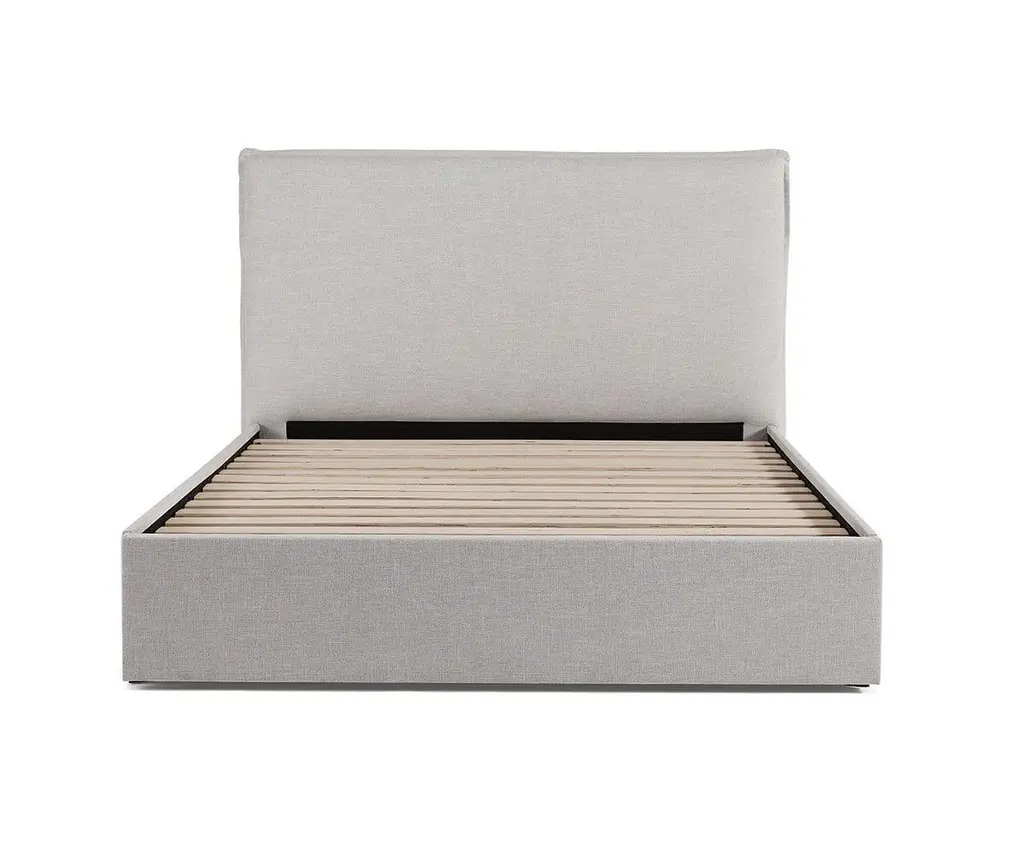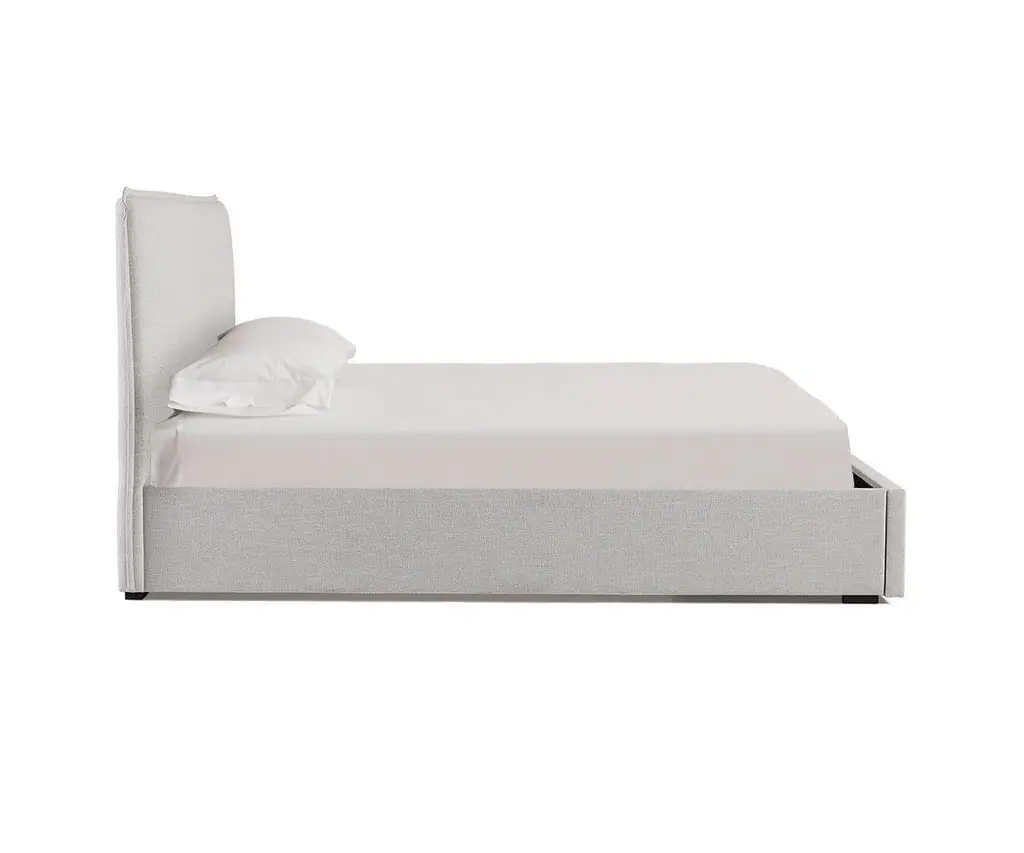 The Blake Upholstered Bed blends the essence of cool, modern design with the comfort you need for a restful night's repose. Pale, textured upholstery covers the svelte frame, and the sweeping upholstered headboard features a gentle knife edge of accenting fabric. Adding to this piece is the convenient storage drawer located in the footboard, which ensures that your bed will be as convenient as it is comfortable.