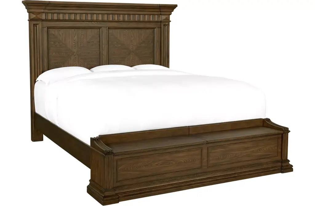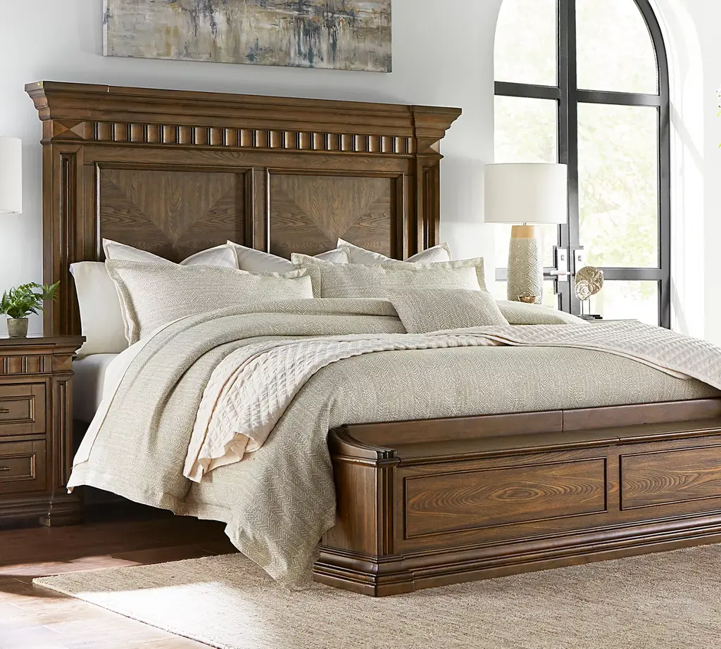 Generous crown moulding, diamond veneer patterns and classic dentil moulding combine for stately elegance in our Breckenridge bed. Also available without footboard storage, this piece is a stunning addition to any sleep space. Use the information below along with the height of your mattress to select the right foundation for your new bed. Our Havertys sleep experts can also help you select the perfect mattress for your sleep needs.