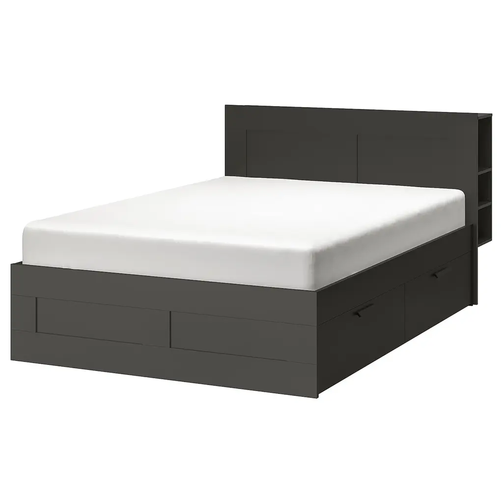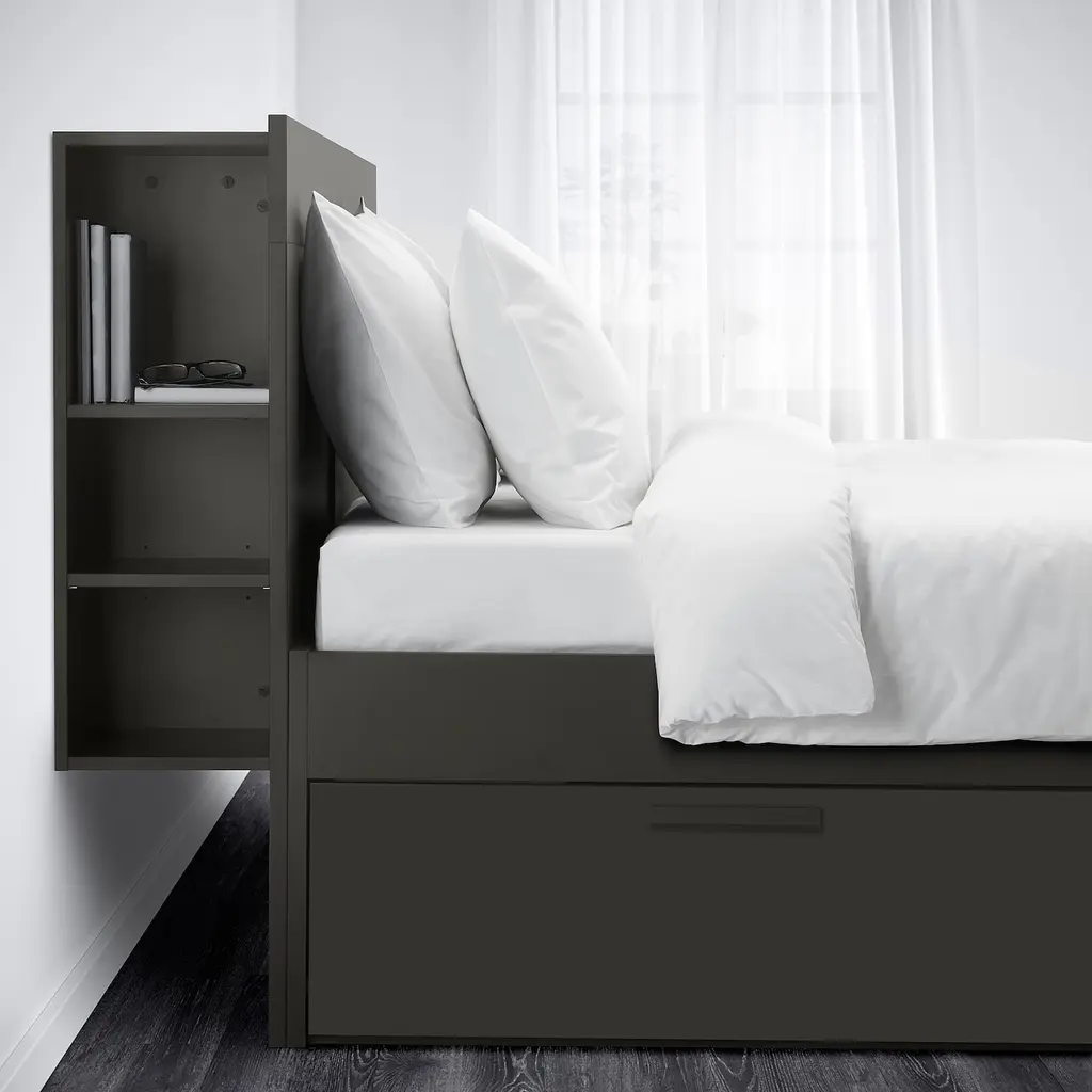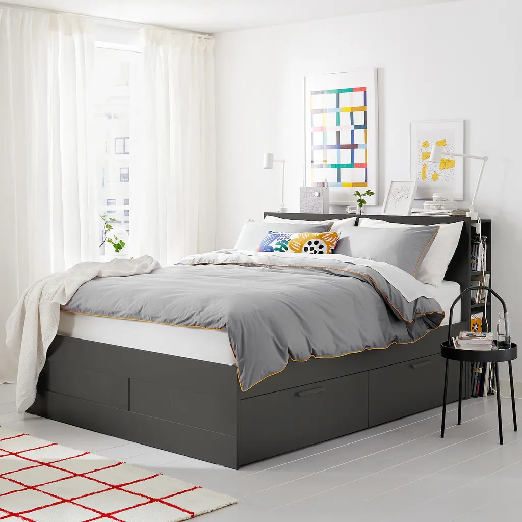 BRIMNES Bed frame with storage & headboard - gray/Luröy Queen. Everything is kept close at hand with integrated storage in the headboard. Ample storage space is hidden neatly under the bed in 4 large drawers. Perfect for storing duvets, pillows and bed linen.