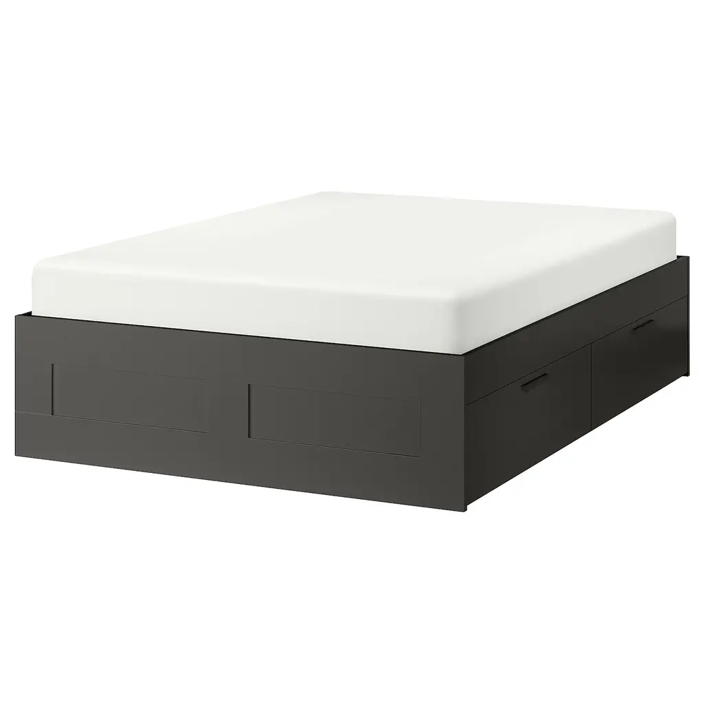 BRIMNES Bed frame with storage - gray/Lönset Queen. Ample storage space is hidden neatly under the bed in 4 large drawers. Perfect for storing duvets, pillows and bed linen. This compact bed frame fits easily in tight spaces and under low ceilings, allowing you to maximize the space in your bedroom.