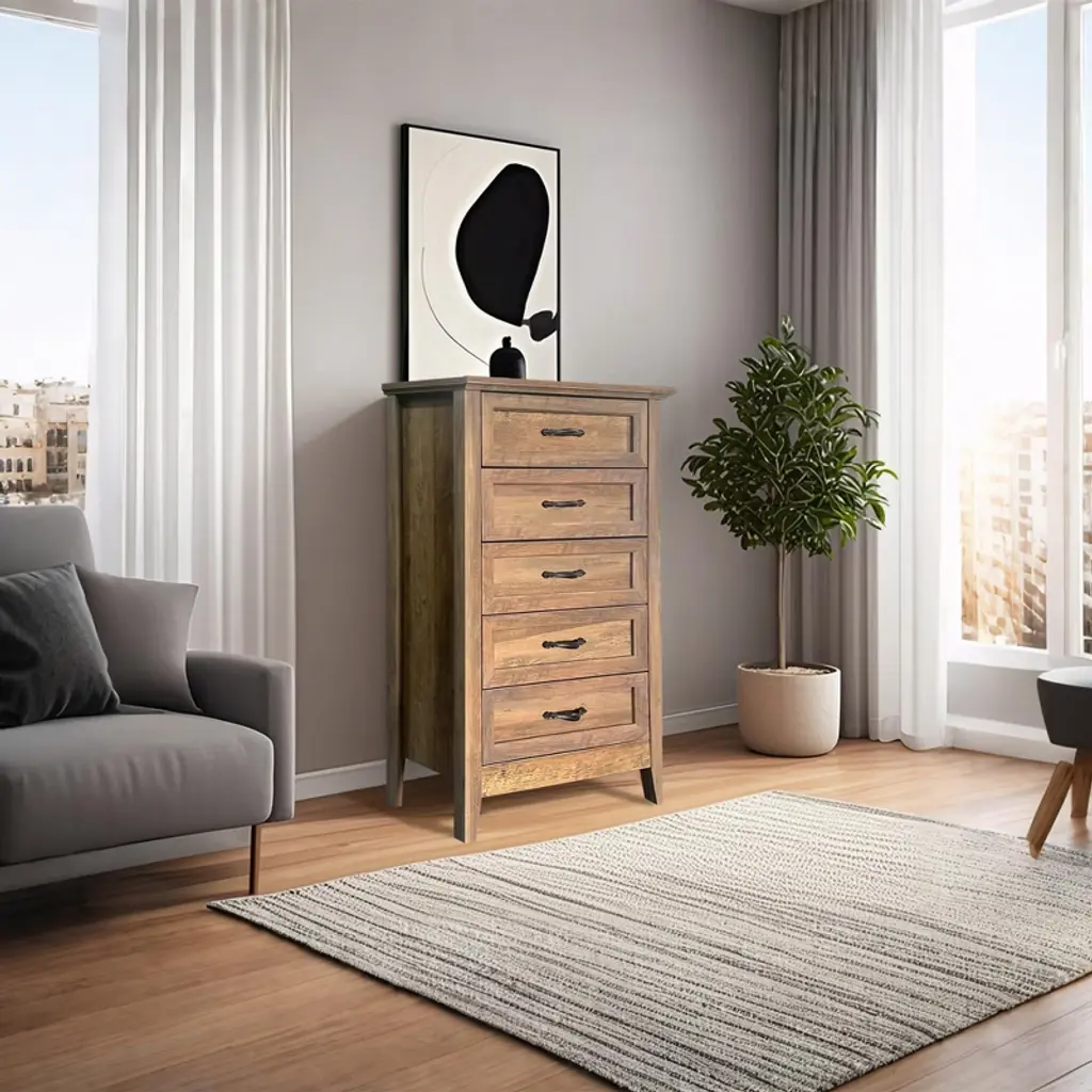 Brown Farmhouse 5 Drawer Dresser Tall Rustic Wood Chest With Vintage Finish Spacious Storage Organizer For Bedroom Ing Room Brown