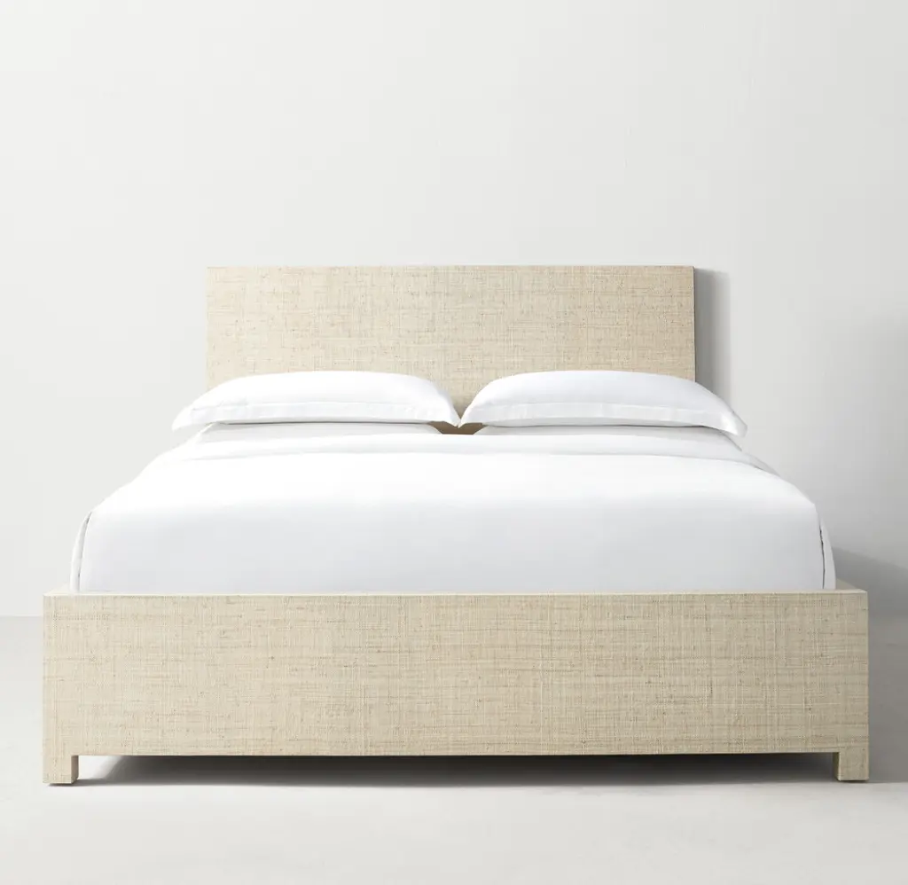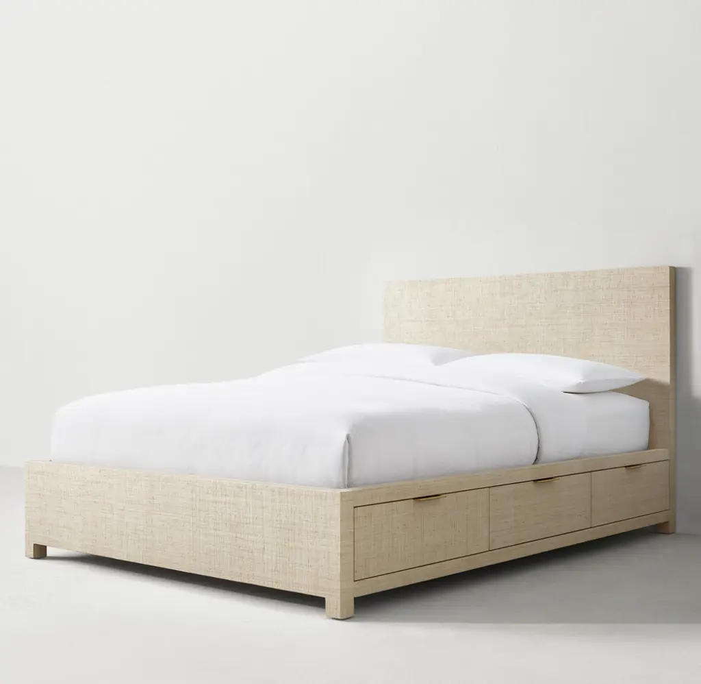 The natural warmth and texture of woven raffia complement our collection's spare forms, emphasizing the inherent beauty of simple, streamlined shapes. Slim metal pulls on the storage drawers serve as refined accents. SHOP THE ENTIRE COLLECTION