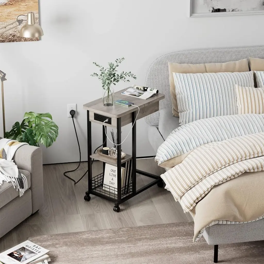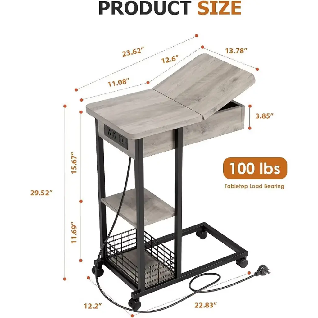C Shaped End Table, Industrial Rolling Bedside Table With Filp Top, Power Outlets, Lockable Wheels, 3 Tier Couch Table Side Table With Storage