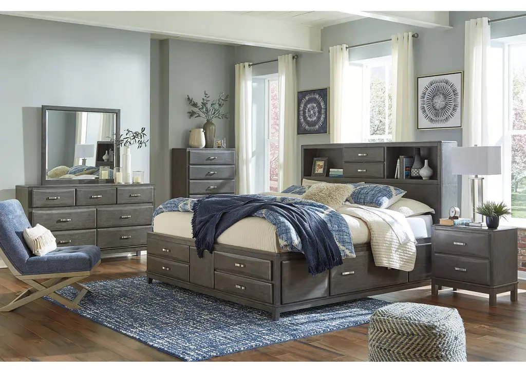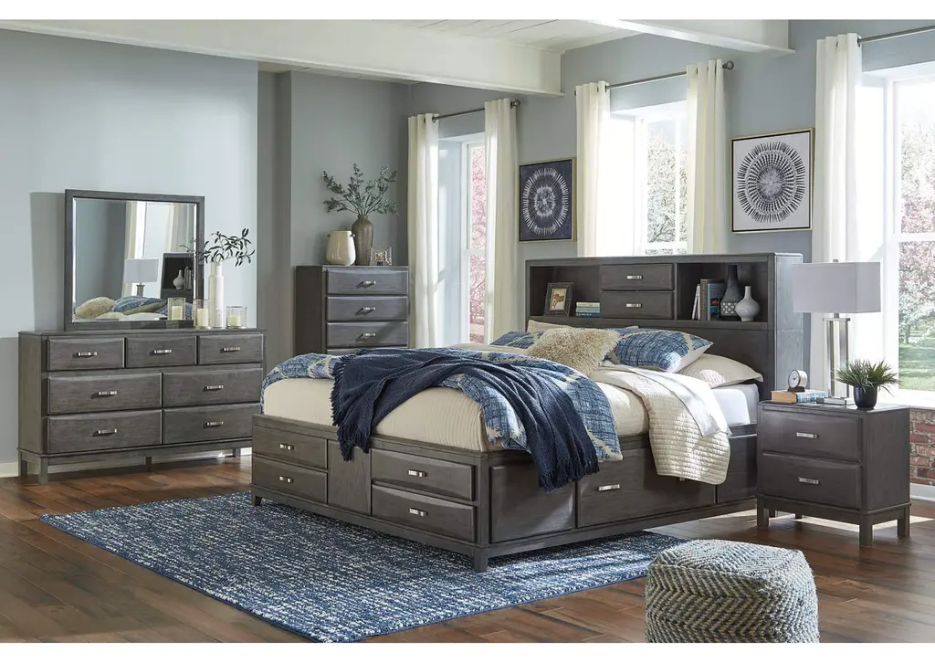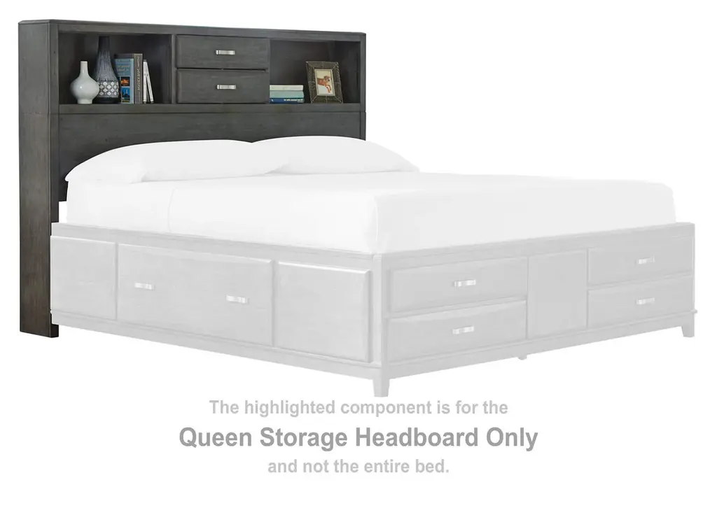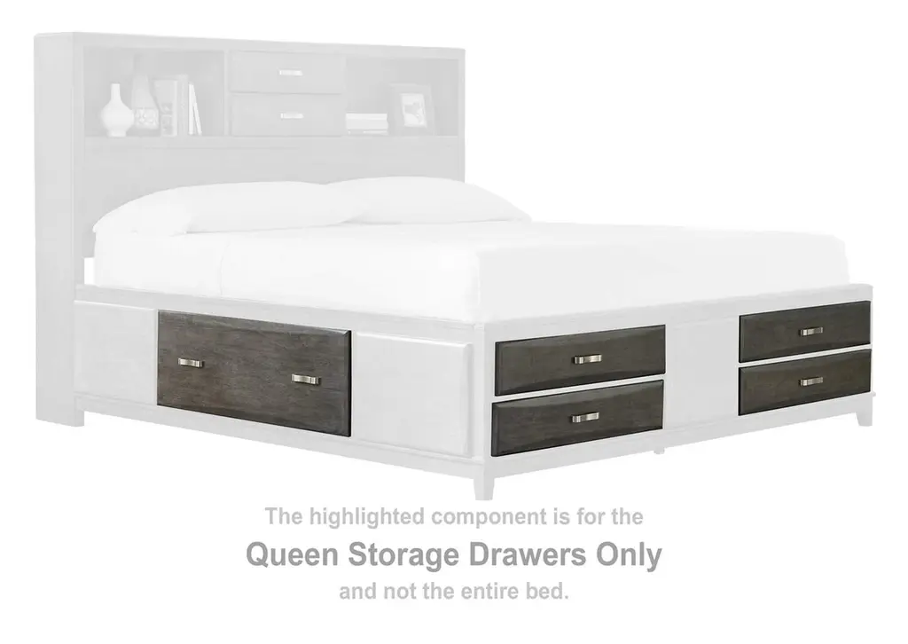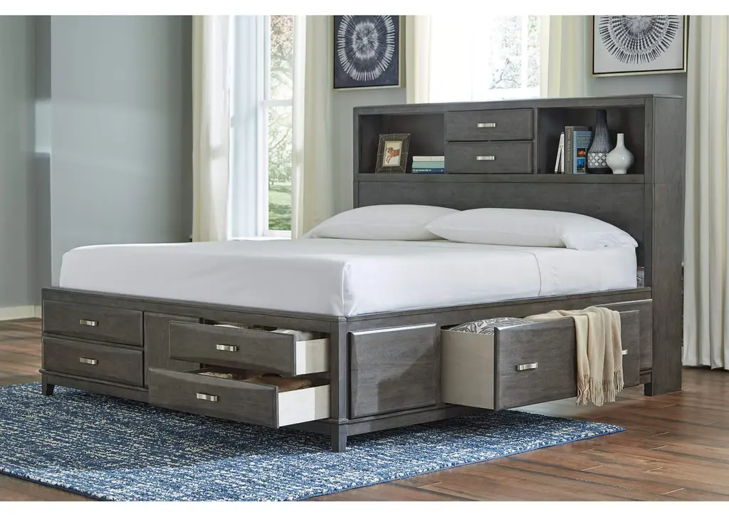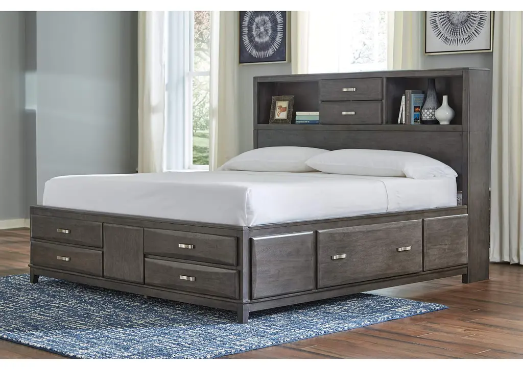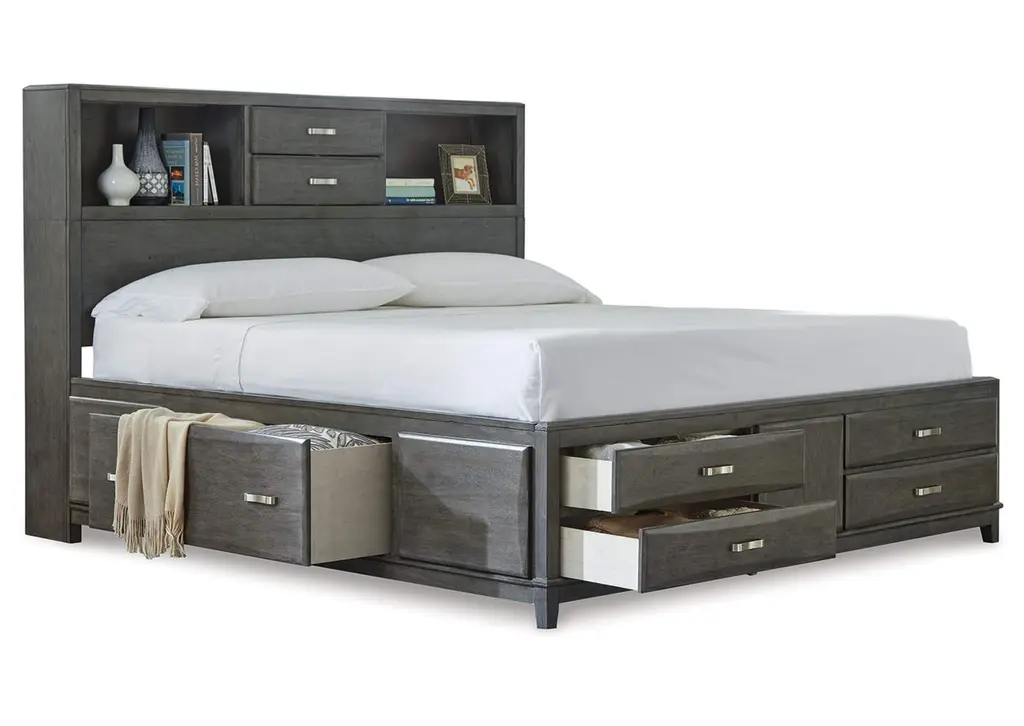 Contemporary style is shaping up beautifully. Designer elements are evident from every angle in the Caitbrook queen storage bed. Quality crafted with dovetail construction, contoured drawers solve small space problems with ease. On each side of the bed a deep drawer provides storage for everything from extra bedding and pillows, to seasonal clothes and more. Additional storage at the top and foot of the bed has you covered from head to toe. Weight 300.000 lbs. (135kgs.)