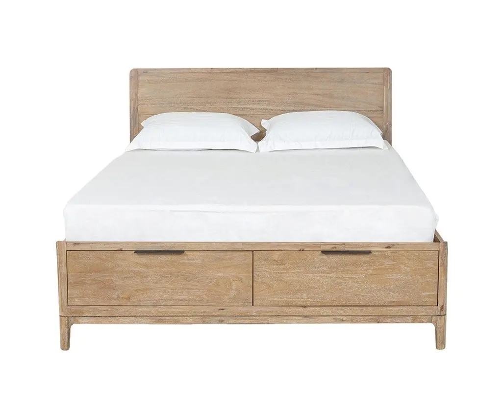 Add the feel of artisanal craftsmanship to your bedroom with the Camen Storage Bed. Crafted with minimalistic design in mind, this bed showcases an unornamented headboard, airy legs and a sturdy, clean-lined frame that allows it to pair perfectly with the rest of the Camen Collection. Storage drawers complete with metal handles create extra storage space for your bedroom necessities. This bed is finished in a unique light gray stain, and features a solid acacia frame with eye-catching veneer paneling. The quality construction of this piece can be seen through finger joints and knots, which ensure that no two pieces are alike. The Camen Collection is transitional by design, featuring a blend of contemporary silhouettes and rustic materials that allow these pieces to effortlessly blend with any modern decor. The natural feel of this piece is anchored by organic features such as knots, highlighted wood grain and color variations. *Queen Bed Pictured
