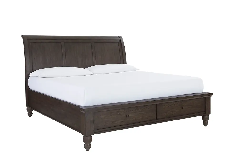 Add the feel of artisanal craftsmanship to your bedroom with the Camen Storage Bed. Crafted with minimalistic design in mind, this bed showcases an unornamented headboard, airy legs and a sturdy, clean-lined frame that allows it to pair perfectly with the rest of the Camen Collection. Storage drawers complete with metal handles create extra storage space for your bedroom necessities. This bed is finished in a unique light gray stain, and features a solid acacia frame with eye-catching veneer paneling. The quality construction of this piece can be seen through finger joints and knots, which ensure that no two pieces are alike. The Camen Collection is transitional by design, featuring a blend of contemporary silhouettes and rustic materials that allow these pieces to effortlessly blend with any modern decor. The natural feel of this piece is anchored by organic features such as knots, highlighted wood grain and color variations. *Queen Bed Pictured