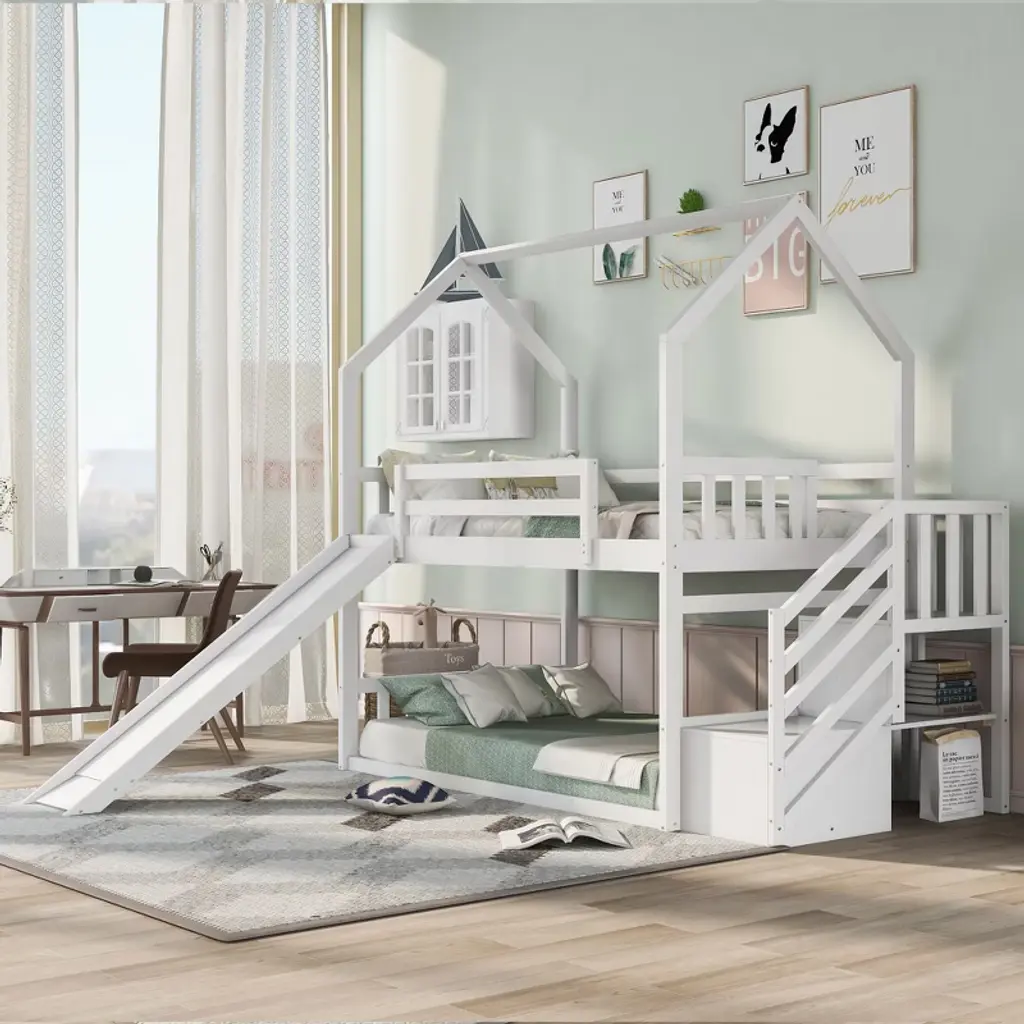 Cavinas Twin Over Twin Bunk Bed House Shaped Pine Bed Frame With Slide, Storage Stairs And Guardrail, White
