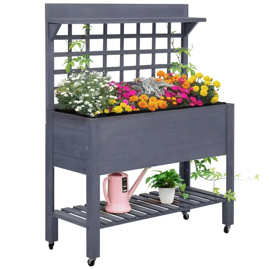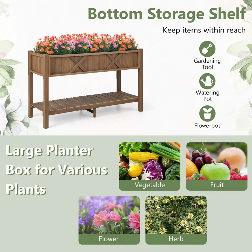 Create a Flourishing Garden and Keep Your Lovely Plants Thriving! Our HIPS raised garden bed measures 47" x 18" x 29" (L x W x H) and comes with a large planter box for various plants to thrive, such as flowers, herbs, vegetables, fruits, etc. And there exists a bottom storage shelf, allowing you to conveniently store your gardening tools, watering pots, and flowerpots, keeping items within reach. Besides, in contrast to normal wooden raised garden beds, our premium HIPS raised garden bed could withstand various weather conditions and ensure that it will not fade, rot, or crack, guaranteeing a lifespan of 5-10 years. And thanks to the reinforced bottom crossbars and an additional supporting leg, this elevated planter box also ensures better stability when filled with soil and plants. Other than that, it comes with drainage holes, ensuring proper water management and preventing water-logging that can harm your precious plants. And the elevated design provides protection for your plants against small animals, while also offering convenient access for watering.FeaturesCrafted of 100% HIPS material, not easy to fade, crack, or rot, ensuring longevity The premium HIPS raised garden bed ensures a lifespan of 5-10 years The bottom crossbars ensure that the structure remains strong and stable The additional supporting leg ensures the frame is not easy to warp or bend Features rich and textured grains and decorated with elegant X-shaped bars The bottom drainage holes ensure good water drainage and well ventilation The elevated design with ergonomic heights can prevent painful kneeling or bending Suitable for cultivating various plants, such as flowers, herbs, vegetables, fruits, etc The ventilated slatted shelf provides a practical solution for gardening accessoriesColor: Blue/Coffee/Black Material: HIPS Overall Dimensions:47" x 18" x 29" (L x W x H) Interior Size of the Planter Box:44" x 15" x 7" (L x W x H) Size of the Bottom Shelf: 47" x 14.5" x 6.5" (L x W x H) Weight Capacity of the Planter Box: 110 lbs Weight Capacity of the Bottom Shelf:66 lbs Net Weight: 40 lbs Package Includes: 1 x HIPS Raised Garden Bed 1 x User’s Manual
