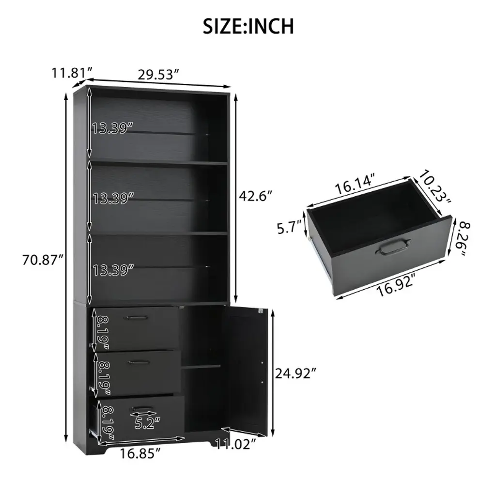 This 71” tall 6-tier bookshelf blends sturdiness and style, crafted from 0.6-inch thick particleboard (waterproof, scratch-resistant) with an anti-tipping device for safety. It has 3 open shelves (with baffles), 3 drawers, and an adjustable-shelf cabinet—ideal for books, files, or decor.Its modern minimalist design fits living rooms, offices, or studies. The smooth surface wipes clean easily, and detailed instructions make assembly simple. Measuring 29.53”L×11.81”W×71”H, it maximizes storage without clutter.This "71” Tall Sturdy 6-Tier Bookshelf with Drawers" is perfect for anyone wanting organized, durable storage that elevates space aesthetics.