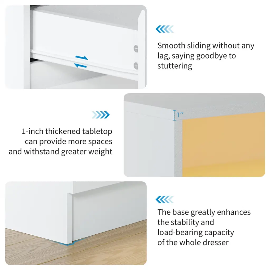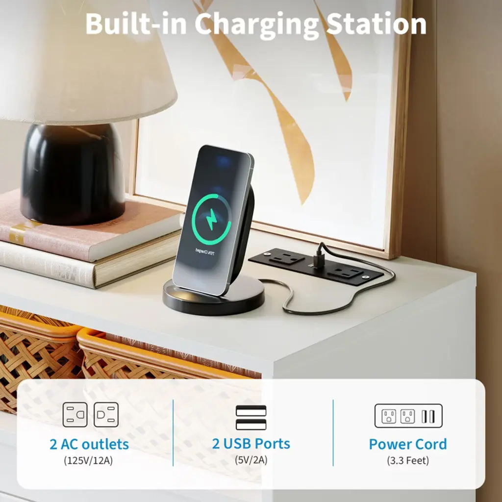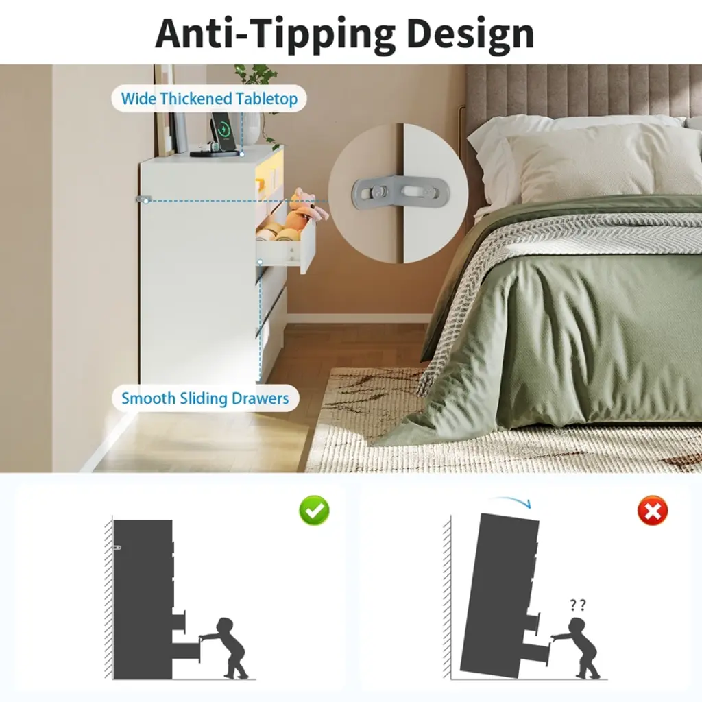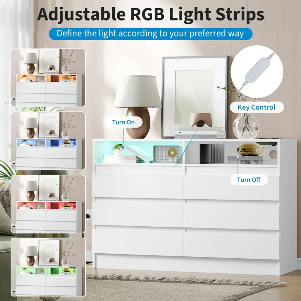 Elevate your bedroom organization with the COZONY Modern 6-Drawer Dresser, featuring innovative ambient lighting and practical power access. This stunning dresser showcases a contemporary floating design with multi-color lighting options that create a soft glow, enhancing your room's ambiance day and night. The built-in power access includes multiple outlet options for convenient device connectivity. Six spacious drawers provide ample storage for clothing, accessories, and bedroom essentials, while the elegant metal handles and smooth ball-bearing slides ensure effortless operation. Crafted from premium materials with a clean finish, this versatile piece functions perfectly as a bedroom dresser, living room console, or entryway organizer. With its modern minimalist aesthetic and practical features, this dresser combines style and functionality for today's homes.2 box shipmennts.