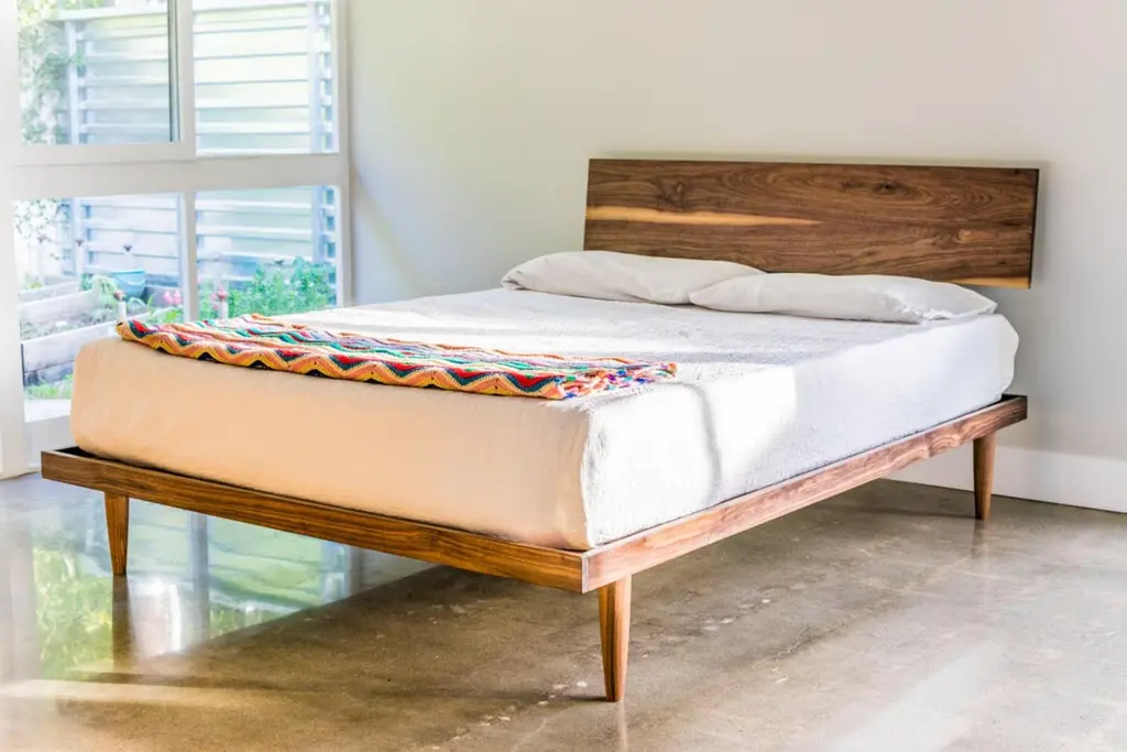 The western bed is an original design that draws on the tradition of Mid-Century Modernism and Danish sensibilities. It's a statement of clean lines, simplicity, and the natural beauty of hardwood. It features a solid walnut headboard canted at a 95 degree angle, a solid walnut perimeter and tapered, solid walnut legs. The brackets that support the headboard are black, powder coated steel. The slats and all support pieces are domestic Baltic birch plywood.The legs on this bed are 10" tall and the side rails are 2.5" tall, and the height of the platform is 11.5" (the mattress is hemmed in by the side rails). The total total footprint for a king is 77.5" x 83". For a cal king it's 73.5" x 87". For a queen its 61.5" x 83". The headboard is 13" tall, with a 10" gap from the platform to the bottom of the headboard (this gap can be modified). The top of the headboard is approximately 38" off the ground. Many of these details can be modified for a small customization fee.Prices for variations on this bed in Walnut are as follows - KING / CAL KING (With Storage) - $3780QUEEN / FULL (With Storage) - $3480KING / CAL KING (No Storage) - $2850QUEEN / FULL (No Storage) - $2700The bed ships flat. The assembly process is very quick and simple- the four rails that compose the basic frame fit into each other with a puzzle-type joint (putting it together is like completing a 4 piece puzzle), then the puzzle joints are reinforced with two bolts in the head rail and a series of 5 screws in each of the head and toe slats. The legs are screwed into place and the headboard attaches with four bolts into the platform and four bolts through the metal support brackets. The entire assembly process should take anywhere from 1 to 2 hours.