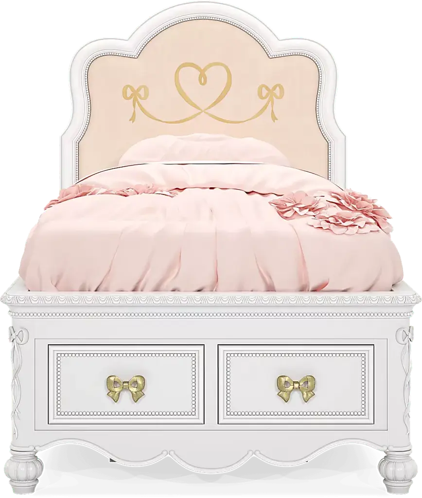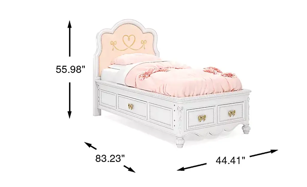 Create a fairytale escape for your little royal with the Disney Princess collection, where every night feels like a bedtime ball and every morning begins a brand-new adventure. Upholstered in blush pink fabric with a beautifully embroidered golden heart and bow motif, this headboard gives way to a bed crafted with an iconic nod to classic princess elegance. The storage footboard and side rails feature four built-in drawers that are ideal for extra blankets, pajamas and more. Each drawer box is equipped with soft-close glides and features French dovetail fronts and English dovetailing in back for ease of use and enhanced durability. Framed in a shimmering sparkle white finish, the design balances softness with structure, while carved rose and bow details at the footboard complete the enchanting look. Mattress and foundation (if required) sold separately.