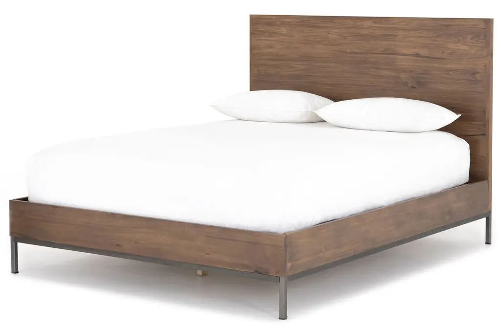 Enhance your bedroom with the Draper Brown King Platform Storage Bed. This Eastern King bed, characterized by a mid-century modern style, combines functionality and aesthetics. The rich walnut finish of the acacia wood headboard and frame provides a warm and inviting look, while the built-in storage drawers offer practical space-saving solutions.