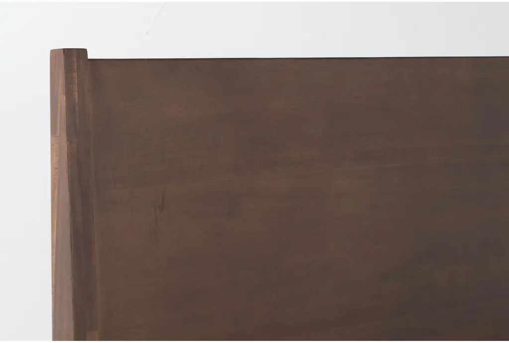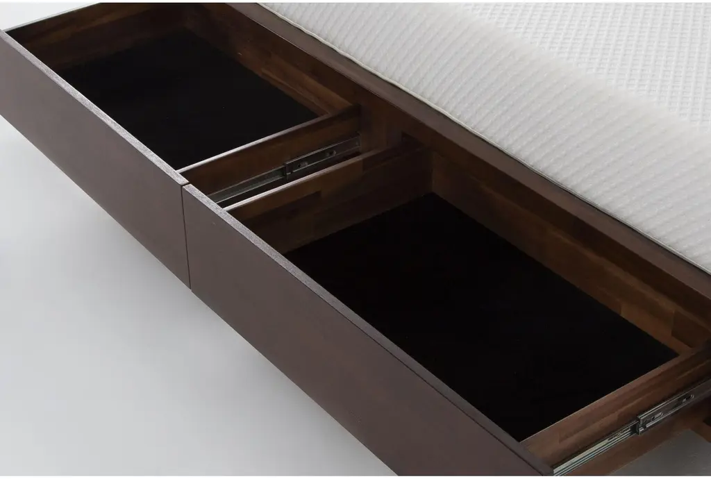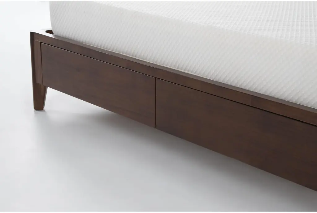 Enhance your bedroom with the Draper Brown King Platform Storage Bed. This Eastern King bed, characterized by a mid-century modern style, combines functionality and aesthetics. The rich walnut finish of the acacia wood headboard and frame provides a warm and inviting look, while the built-in storage drawers offer practical space-saving solutions.