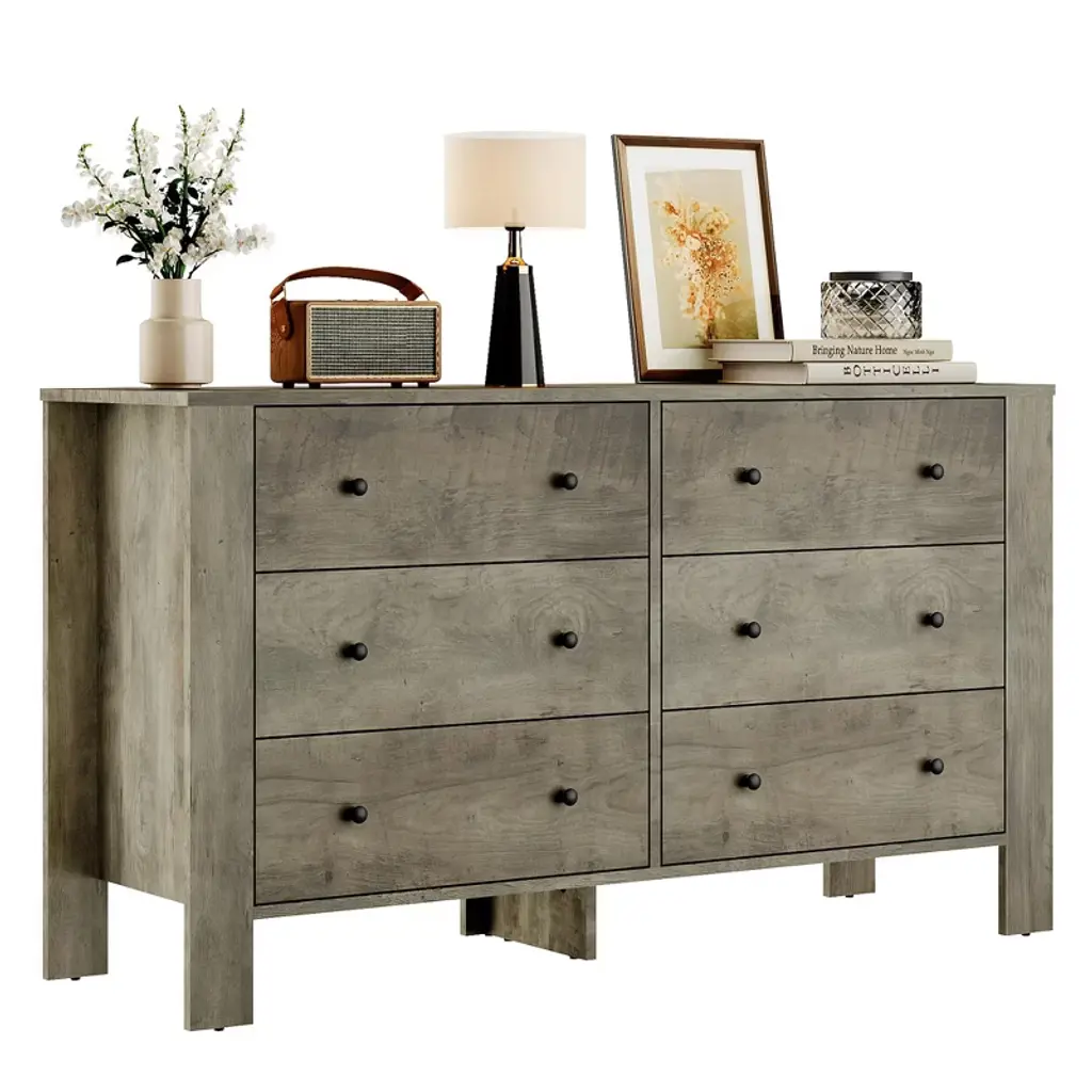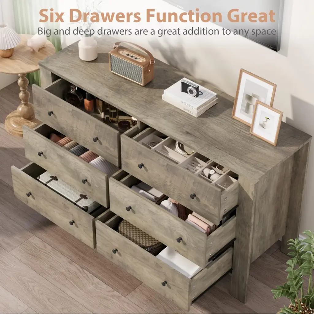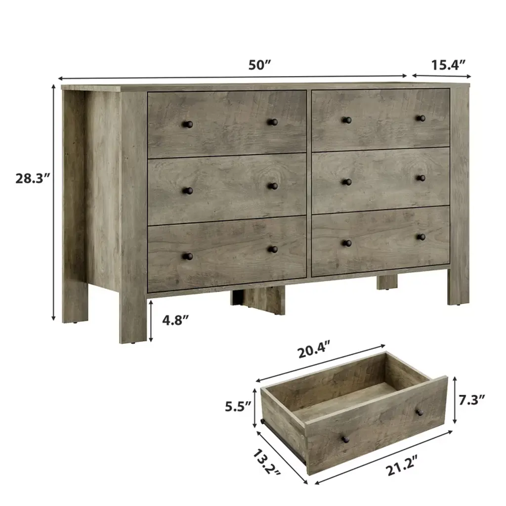 6-Drawer Nursery Dresser: This contemporary dresser measures 15.4"D x 50"W x 28.3"H and features 6 spacious drawers, each with a depth of 5.5 inches. It’s perfect for organizing clothing, documents, jewelry, and personal belongings. The expansive tabletop offers ample space for lamps, picture frames, plants, and decorative accents. Streamline your living area, keep things tidy, and add a touch of warmth to your roomRustic Modern Design: This dresser for bedroom features a chic finish paired with classic black handles, embodying a contemporary, minimalist look. Its adaptable design harmonizes effortlessly with various home styles, bringing both brightness and organization to your spaceStable and Sturdy: This dresser is constructed from high-quality MDF, making it durable with a natural texture that resists deformation. Featuring five robust cabinet legs and two anti-tip devices, it provides enhanced stability and ensures your family's safetyVersatile Storage Solution: This chest of drawers offers a generous interior that can fit into various settings. Whether you need it as a bedroom dresser, bedside table, living room storage, baby toy organizer, or an entryway unit, it effortlessly accommodates your storage requirements. You might even use it as a TV stand for your electronic devicesEasy Installation: The bedroom dresser comes with clear installation instructions, individually wrapped and labeled components for easy assembly