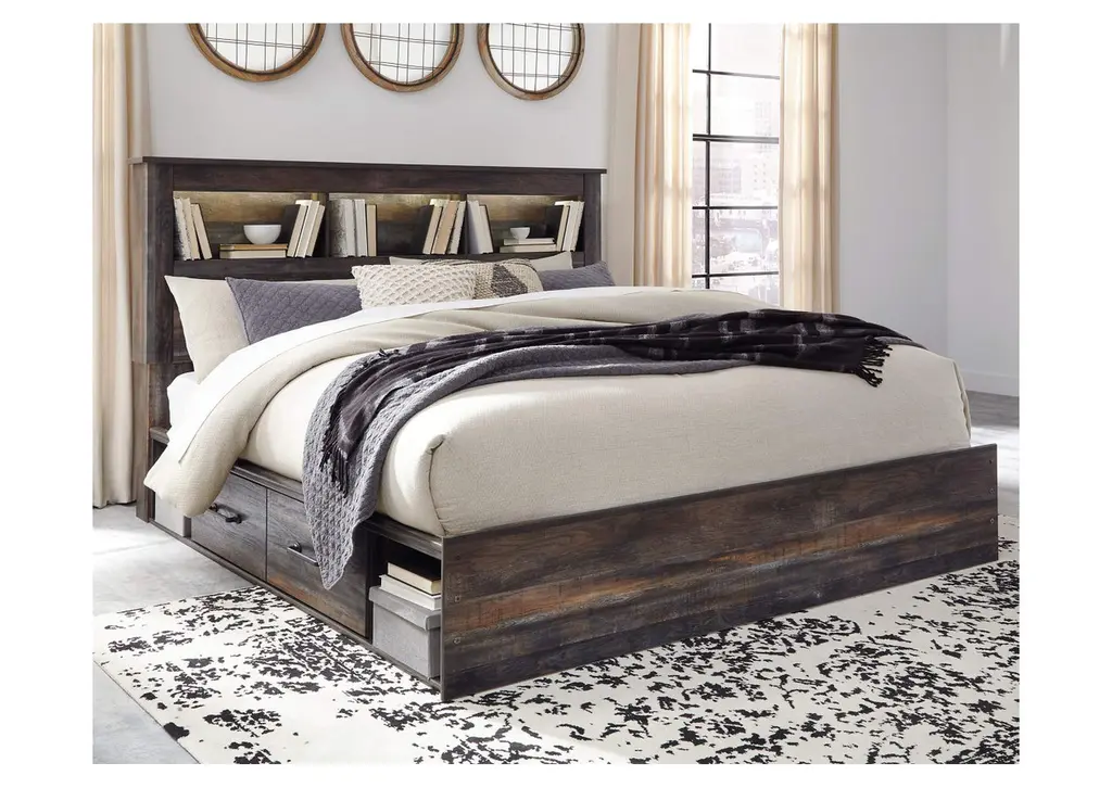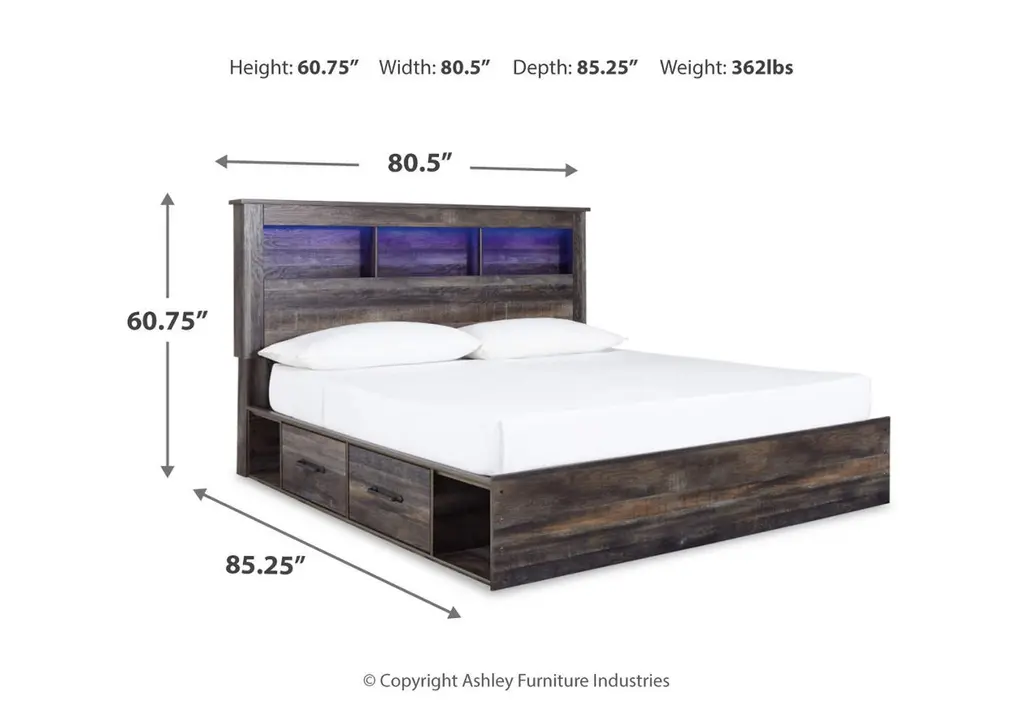 When merged in just the right way, rustic and industrial styles can make one happy marriage. Case in point: the Drystan king bookcase bed with storage. A refined take on barn board beauty, its complex, replicated wood grain showcases hints of burnt orange and teal tones for a sense of weatherworn authenticity. Three open cubbies lined with a dimming LED light strip keep bedtime reads top of mind. Underneath the bed: four smooth-gliding drawers and four open cubbies that accommodate casually cool storage bins. Weight 364.000 lbs. (163.8kgs.)