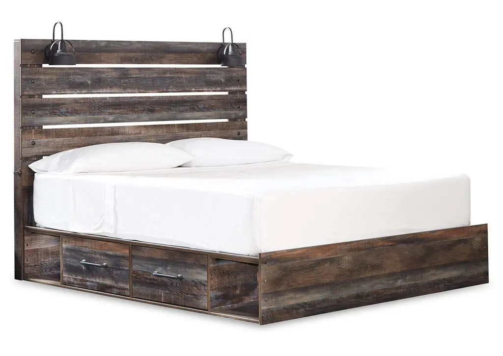 The Drystan storage bed spans the gap between farmhouse and factory. Its rustic reclaimed look complements the down-home country or urban industrial decor with equal ease. Made of engineered wood with a replicated weathered woodgrain finish.