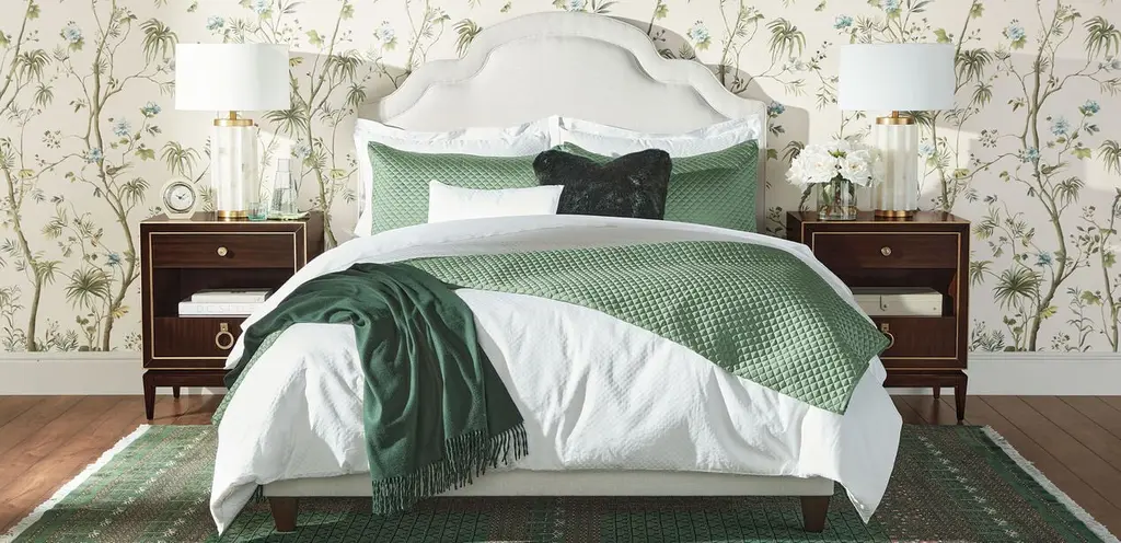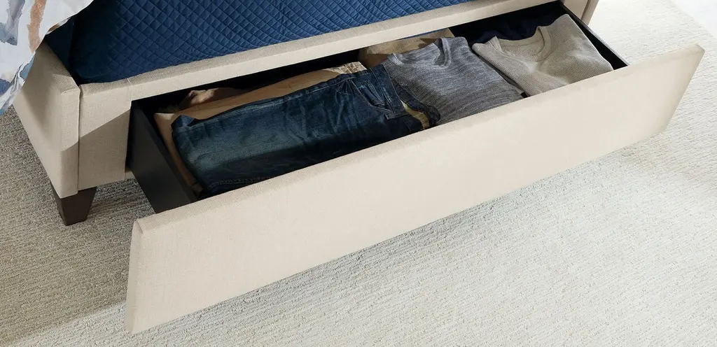 The curved arch headboard of our Elenora custom storage bed is so stunning that no one will notice the practical storage drawer in its base—it'll be your secret place to store bed linens and anything else you'd like to tuck away. Decide how to style your headboard, and then choose from any available fabric to have your Elenora tailored by hand.
