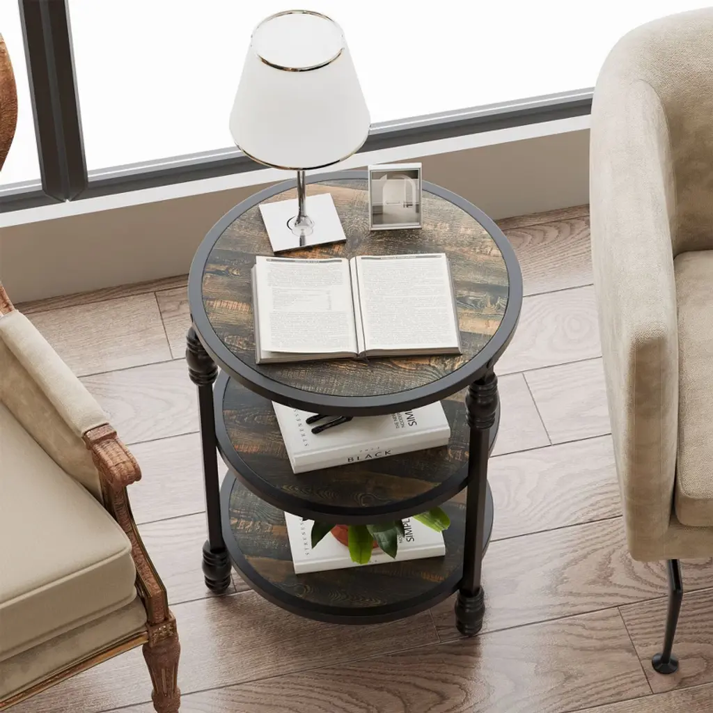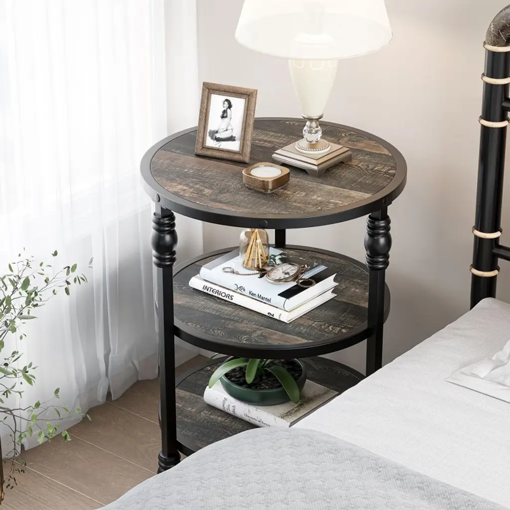 End Table 3-tier Round Side Table, Living Room Accent Table With Storage Shelf, Metal Industrial Wood Bed Side Table, Night Stand For Bedroom, Sofa